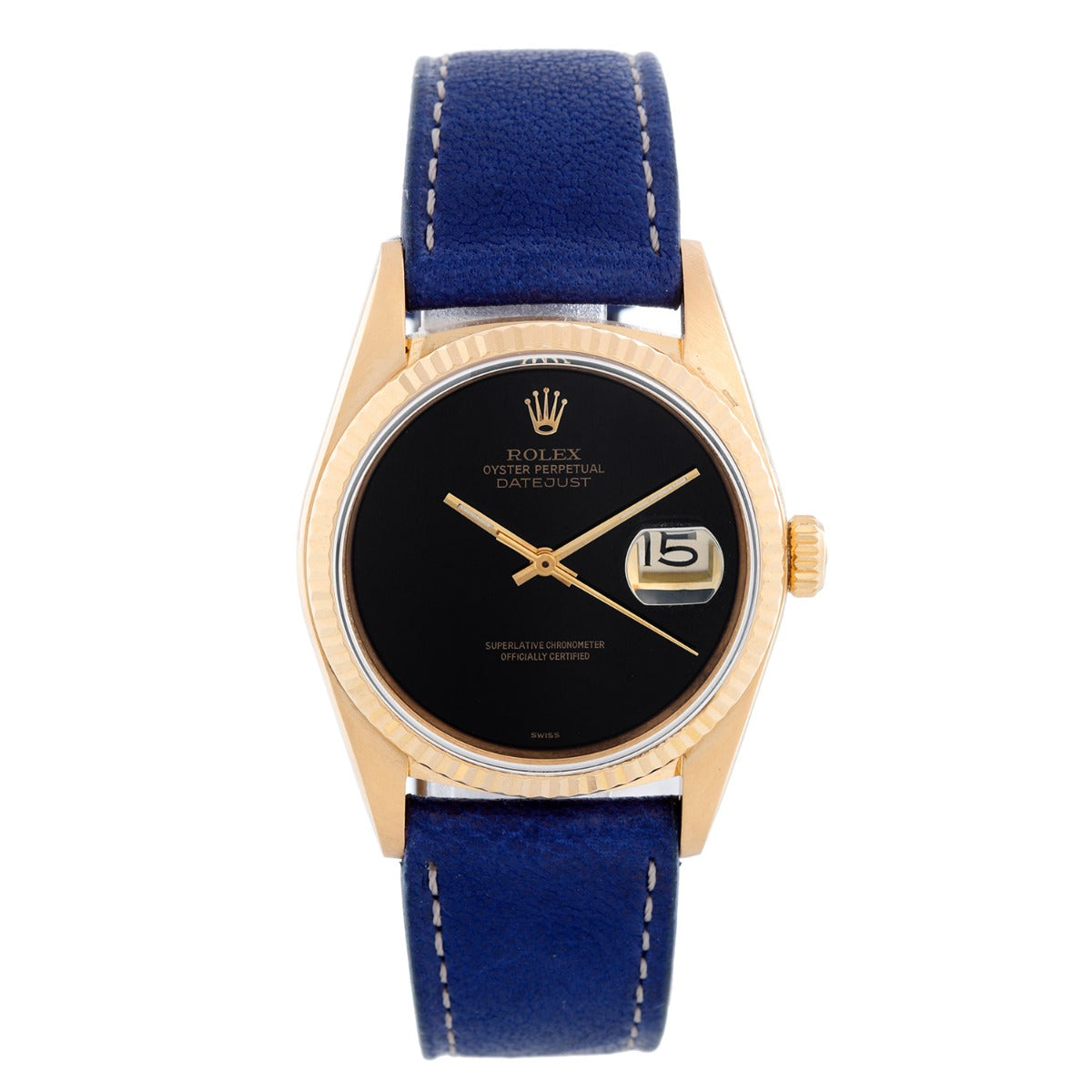 Rolex Datejust Men's 18k Watch Blue Vignette 16018 - Automatic winding, Quickset, Sapphire crystal. 18k yellow gold case with fluted bezel. Factory Onyx dial. Blue strap with Rolex 18K Tang buckle. Pre-owned with Rolex box and papers.