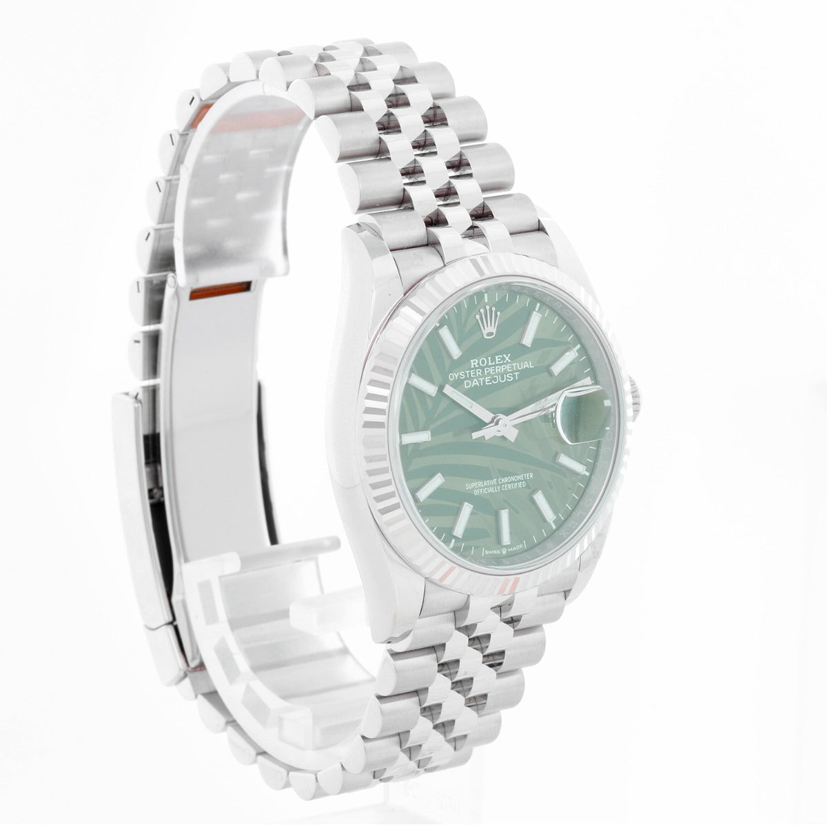 Rolex Datejust Men's Stainless Steel Watch Green Palm Motif Dial 126234 - Automatic winding, 31 jewels, Quickset, sapphire crystal. Stainless steel case with 18k white gold fluted bezel (36 mm). Green palm motif dial with index markers. Stainless steel Jubilee bracelet. Pre-owned with Rolex box and card