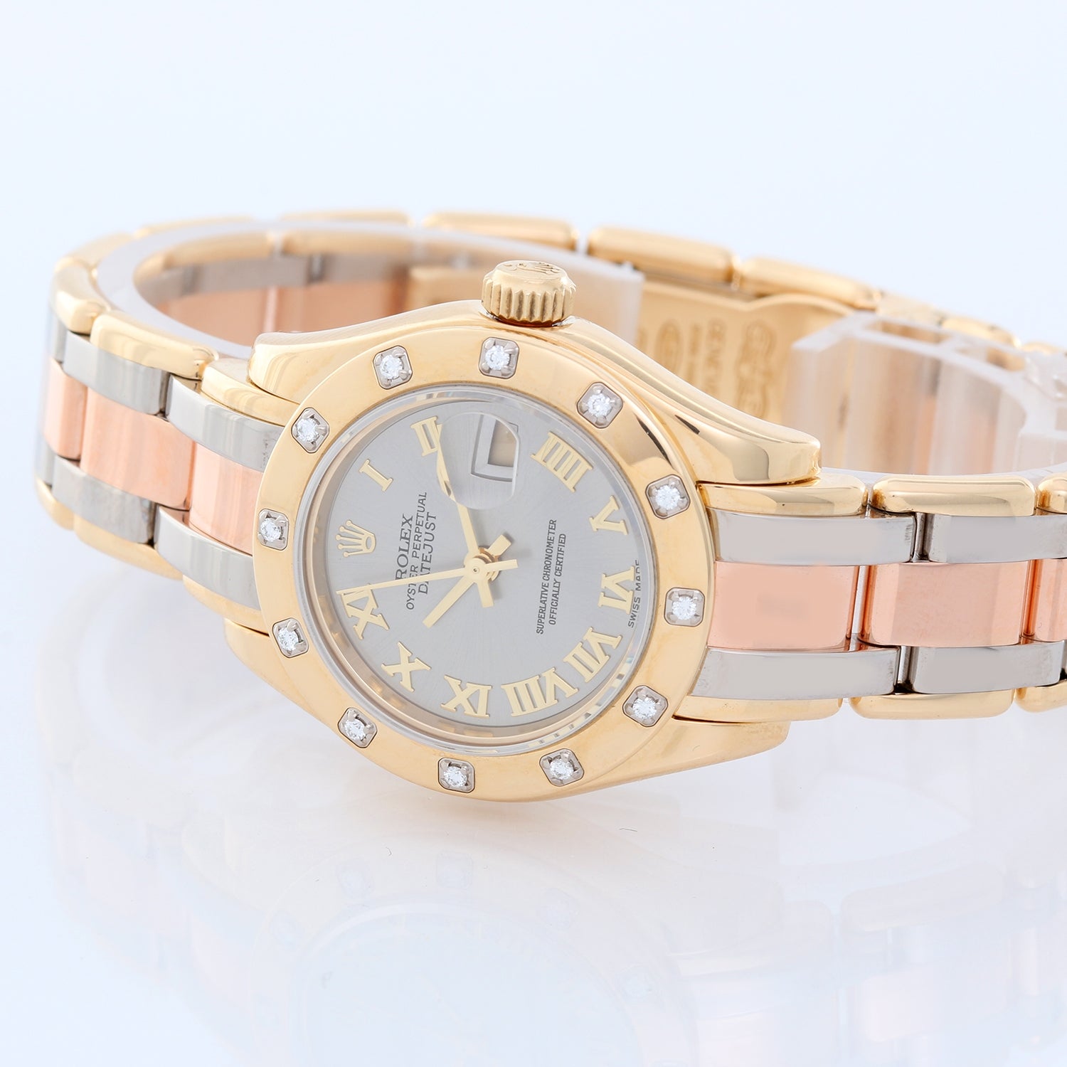 Rolex Lady Datejust Pearlmaster 18k Yellow Gold Ladies Diamond Watch 80318 - Automatic winding, 31 jewels, Quickset, sapphire crystal. 18k yellow gold case with factory 12 diamond bezel (29mm diameter). Slate silver dial with yellow gold Roman numerals. 18k yellow gold white and rose gold tridor oyster bracelet. Pre-owned with box and papers.