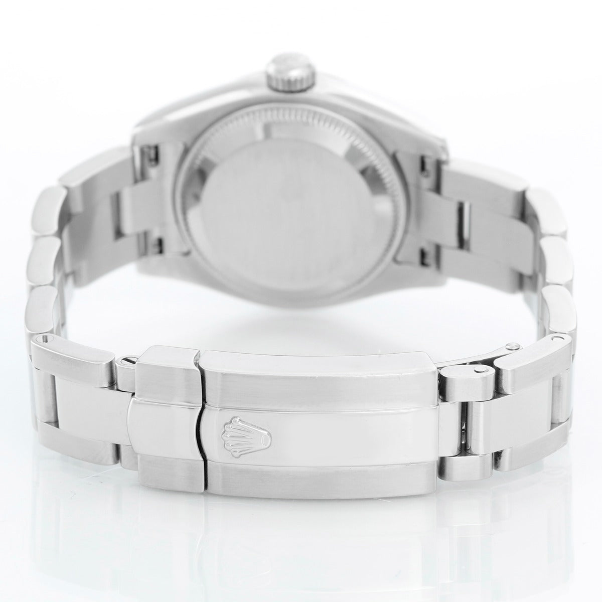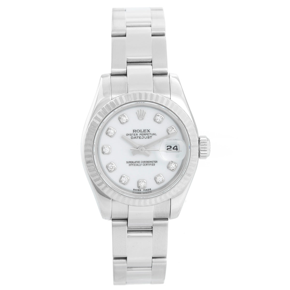 Rolex Lady Datejust Stainless Steel Ladies Watch 179174 - Automatic winding; 31 jewel; sapphire crystal. Stainless steel case with 18k white gold fluted bezel (26mm diameter). White dial with factory diamond hour markers. Stainless steel hidden-clasp oyster bracelet. Pre-owned with custom box