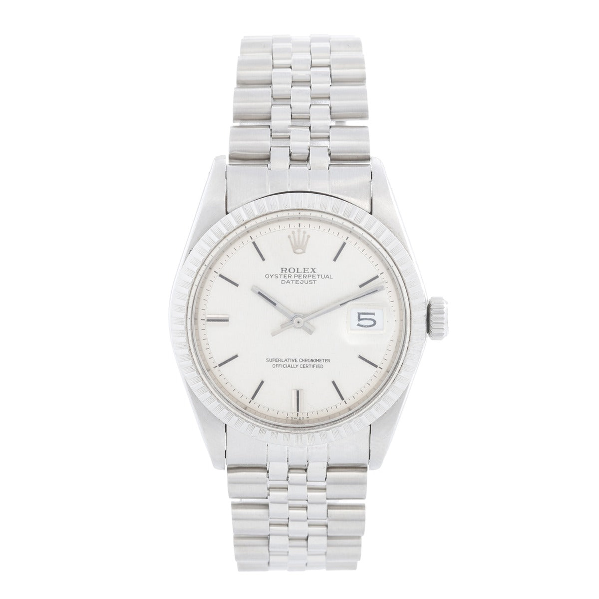 Rolex Datejust Men's Steel Automatic Winding Watch 1603 - Automatic winding with date; acrylic crystal. Stainless steel case with engine turned bezel (36mm diameter). Silver textured dial with stick markers. Stainless steel jubilee bracelet. Pre-owned with custom box.
