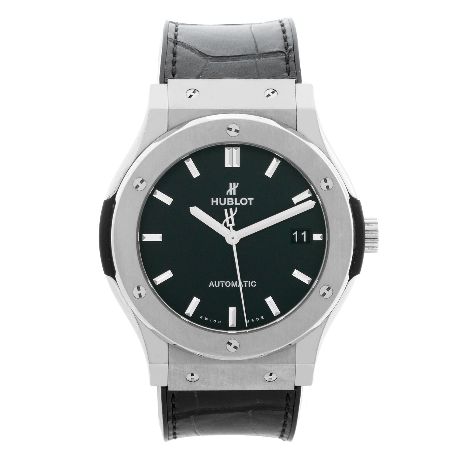 Hublot Classic Fusion Chronograph Automatic Men's Watch 511.NX.1171.RX - Automatic winding chronograph; Date window at 3:00 . Titanium case ( 45 mm) Skeleton caseback . Black dial with polished hour markers . Black rubber alligator pattern strap with stainless steel Hublot deployant clasp . Pre-owned with Hublot box and papers .