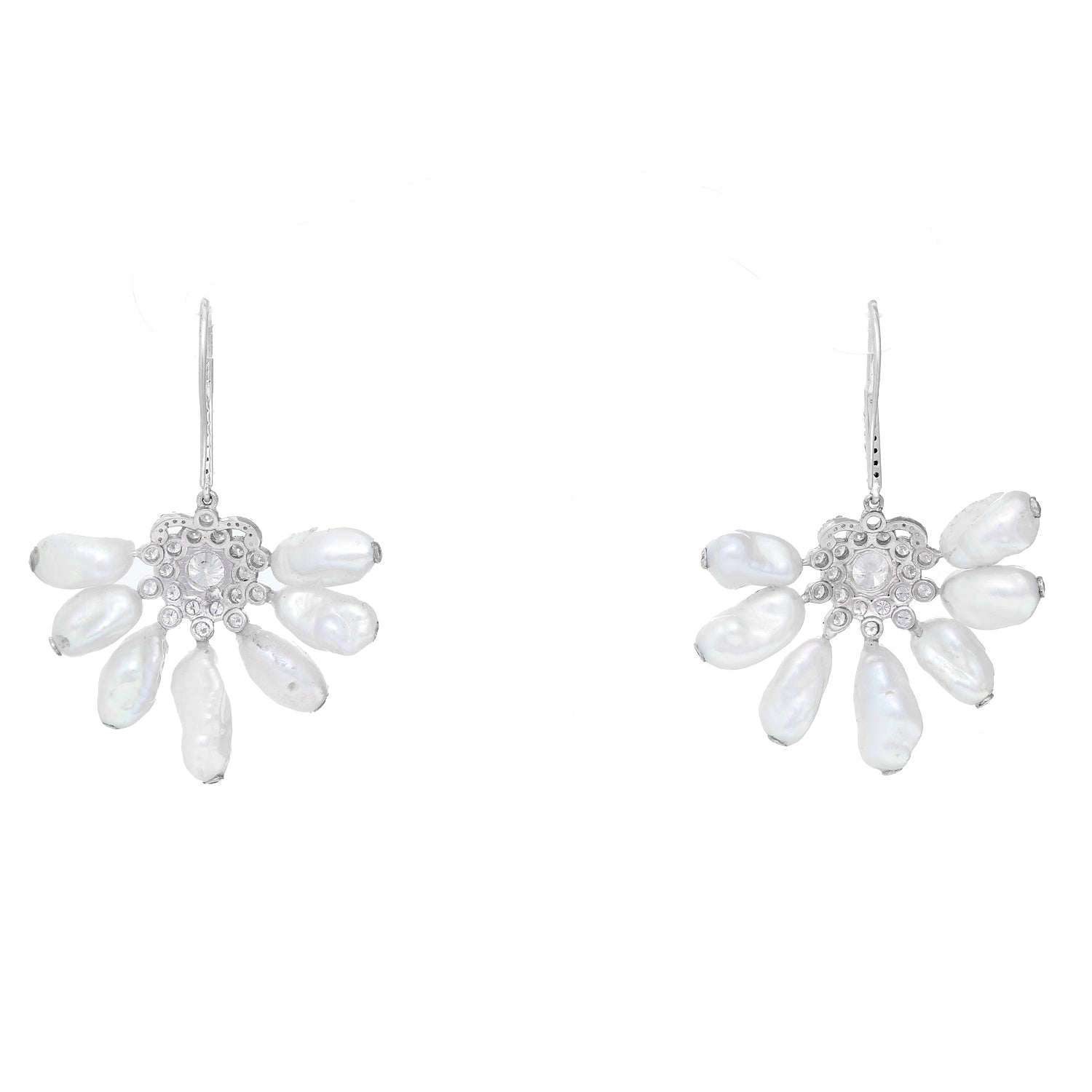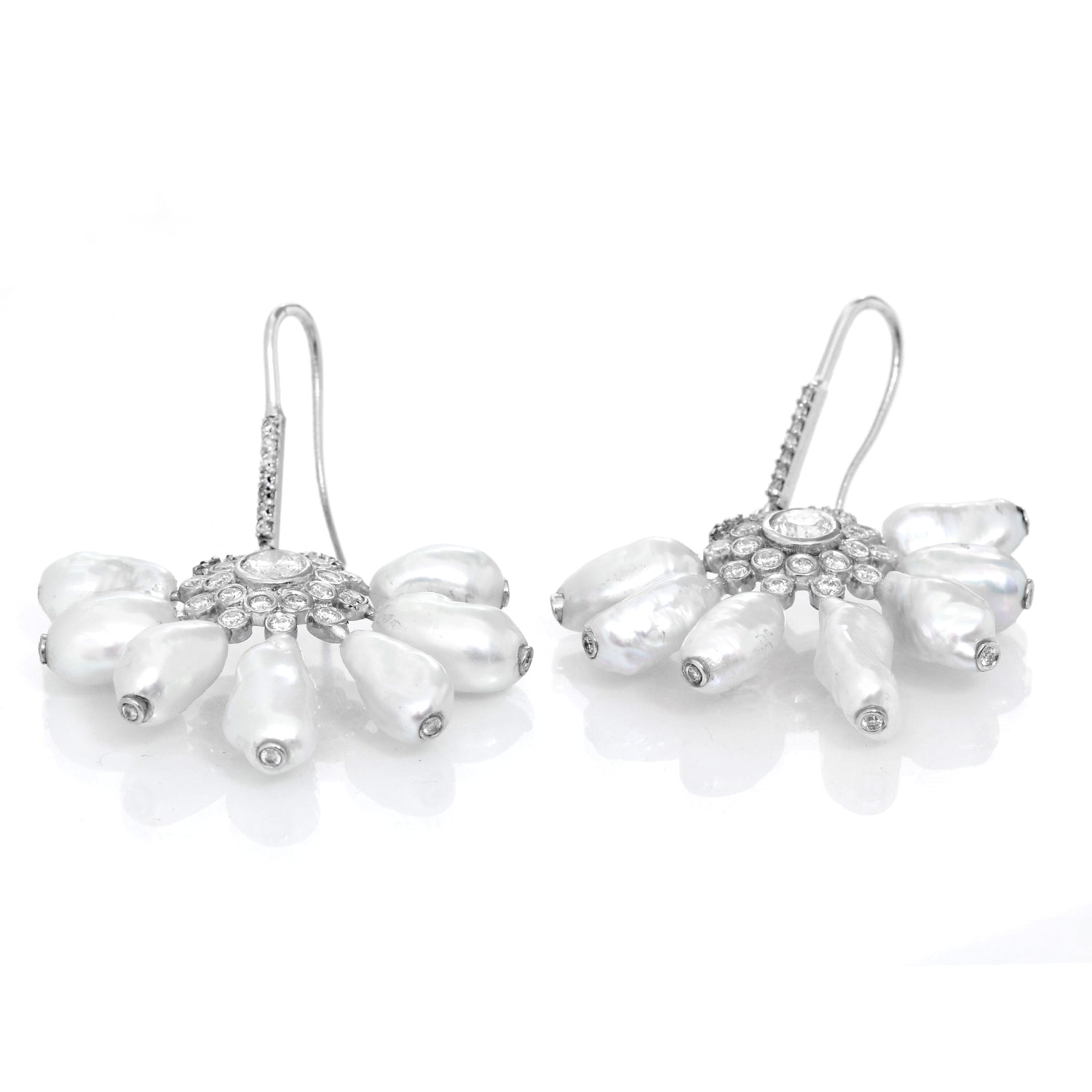 14K White Gold Pearl and Diamond Earrings - . Designer inspired dangling earrings with 7 pearl drops radiating from a diamond flower. Total weight 11.7 grams.
