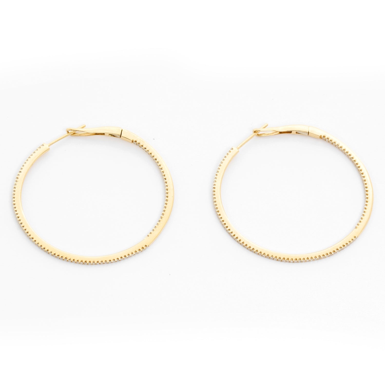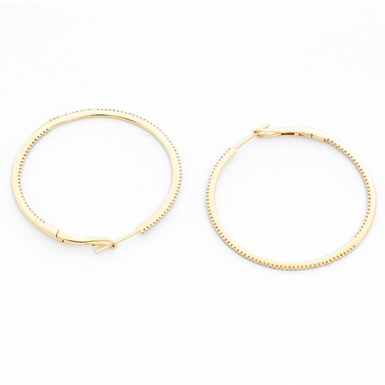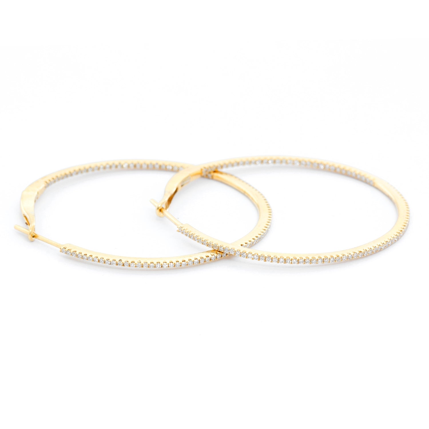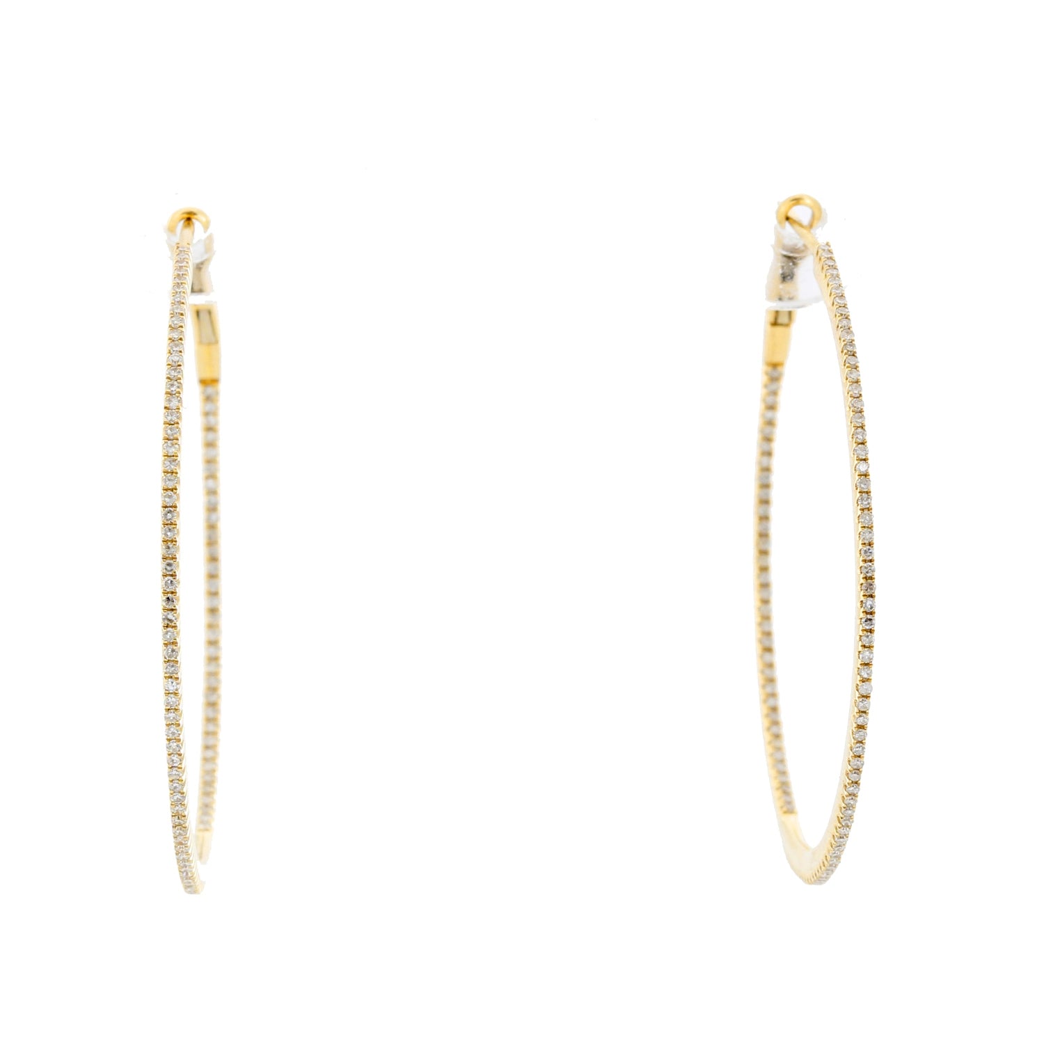 14K Yellow Gold Round Inside Out Hoops - Stunning and delicate 14K Yellow Gold hoops. Measuring 1 1/2 in. in diameter with .55 cts of diamonds. Clarity SI. Color GH. Total weight 4.6 grams.