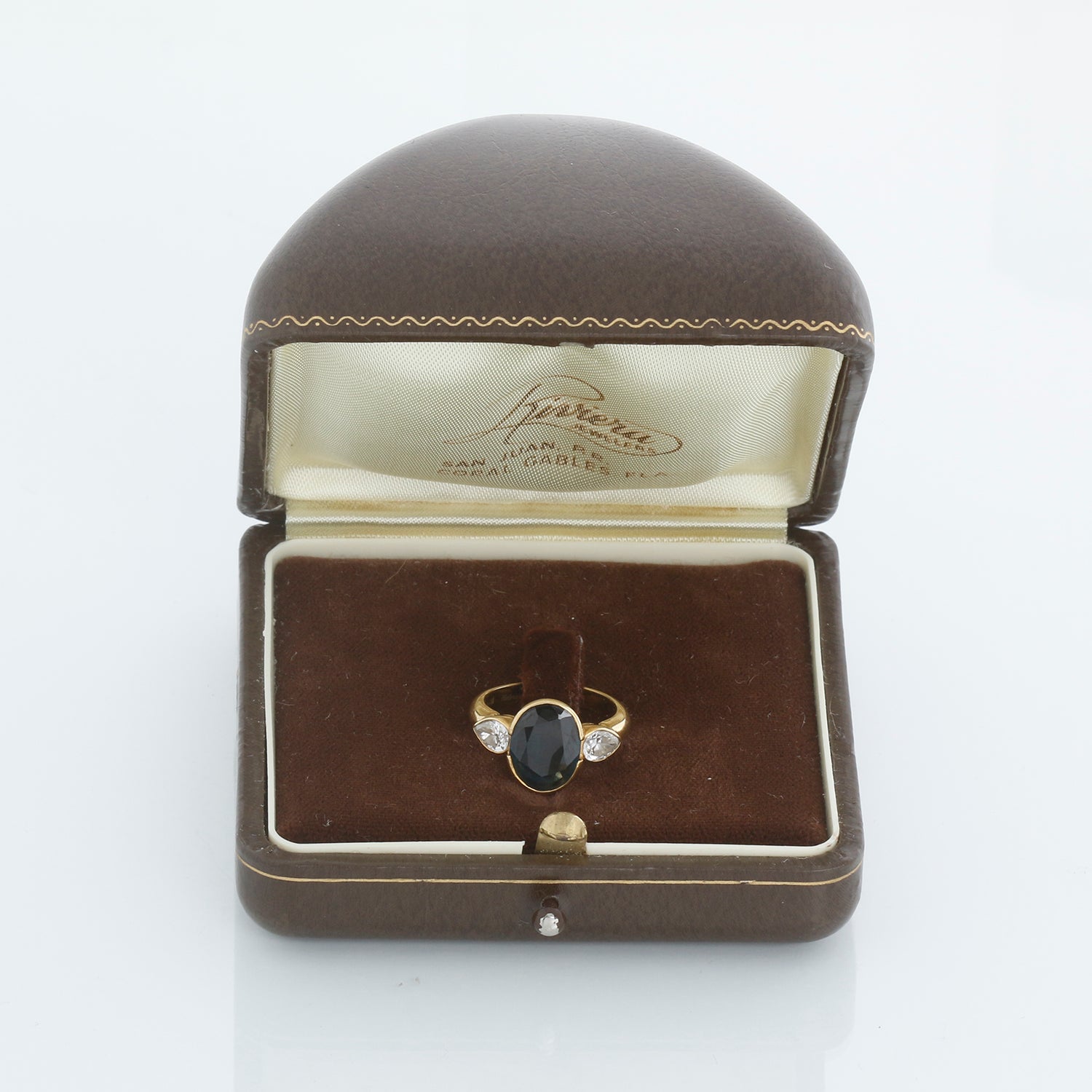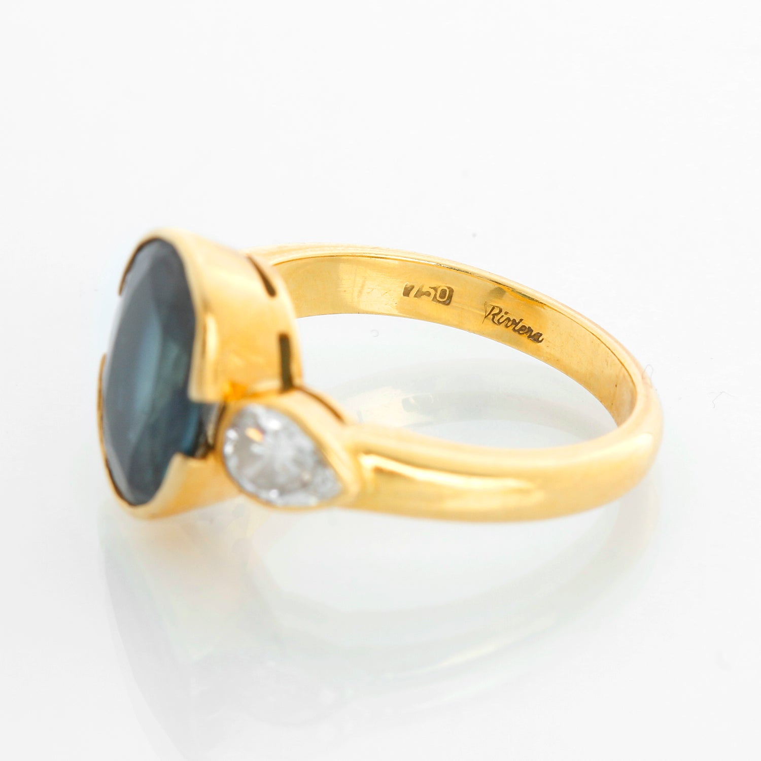 18K Yellow Gold Australian Blue Sapphire Ring Size 5 - 18K ladies ring with one faceted oval cut Australian blue sapphire weighing 3.19 carats and diaplaying medium dark, very very slightly greenish blue color and two pear cut diamond with approximate .64 carats. Overall VS-1 clarity F-G color. Pre-owned with a Rivera box.