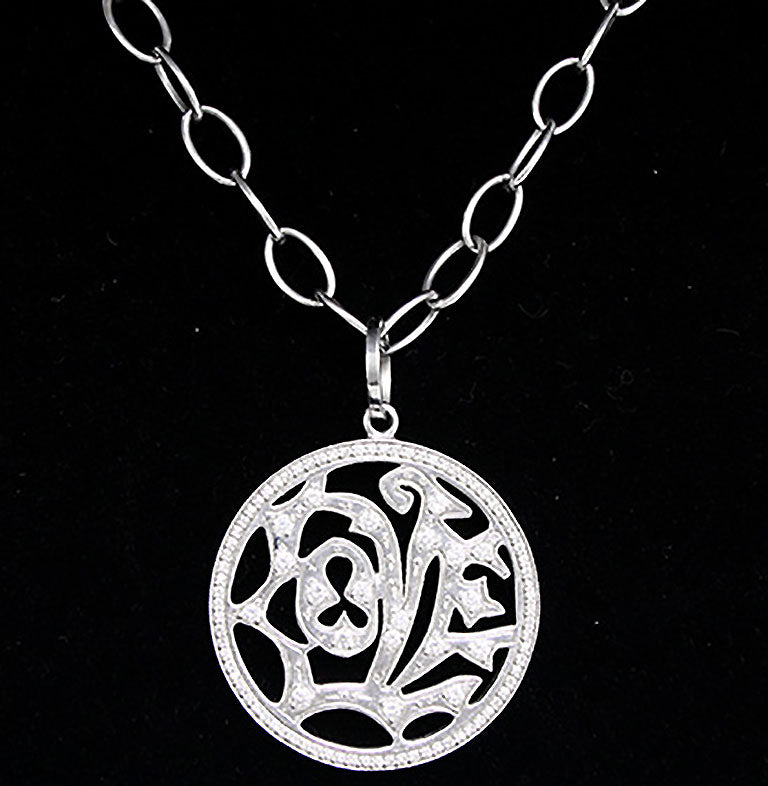 Beautiful 18K White Gold and Diamond LOVE Pendant. This beautiful pendant is similar to a popular designer. It is round and the diameter is apx. 1-1/2 inches. It has apx. 1 carat of white diamonds sprinkled on it. The pendant weighs 15 grams and the chain weighs 15.6 grams. The chain is 18 inches long.
