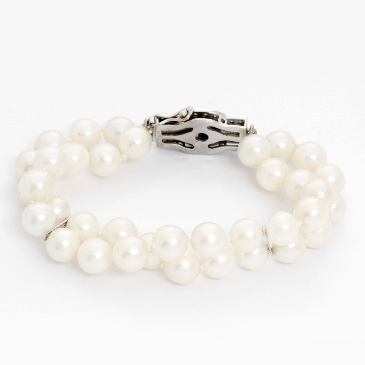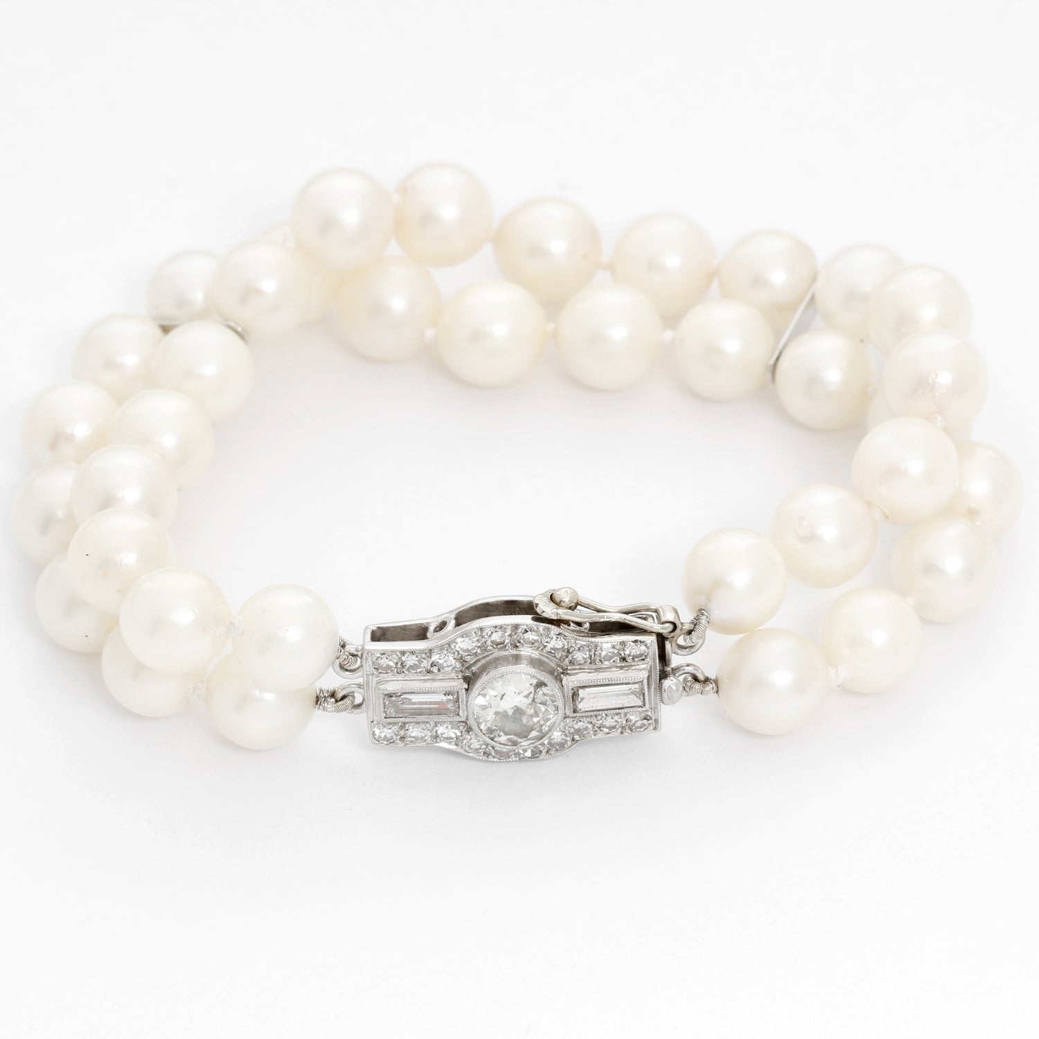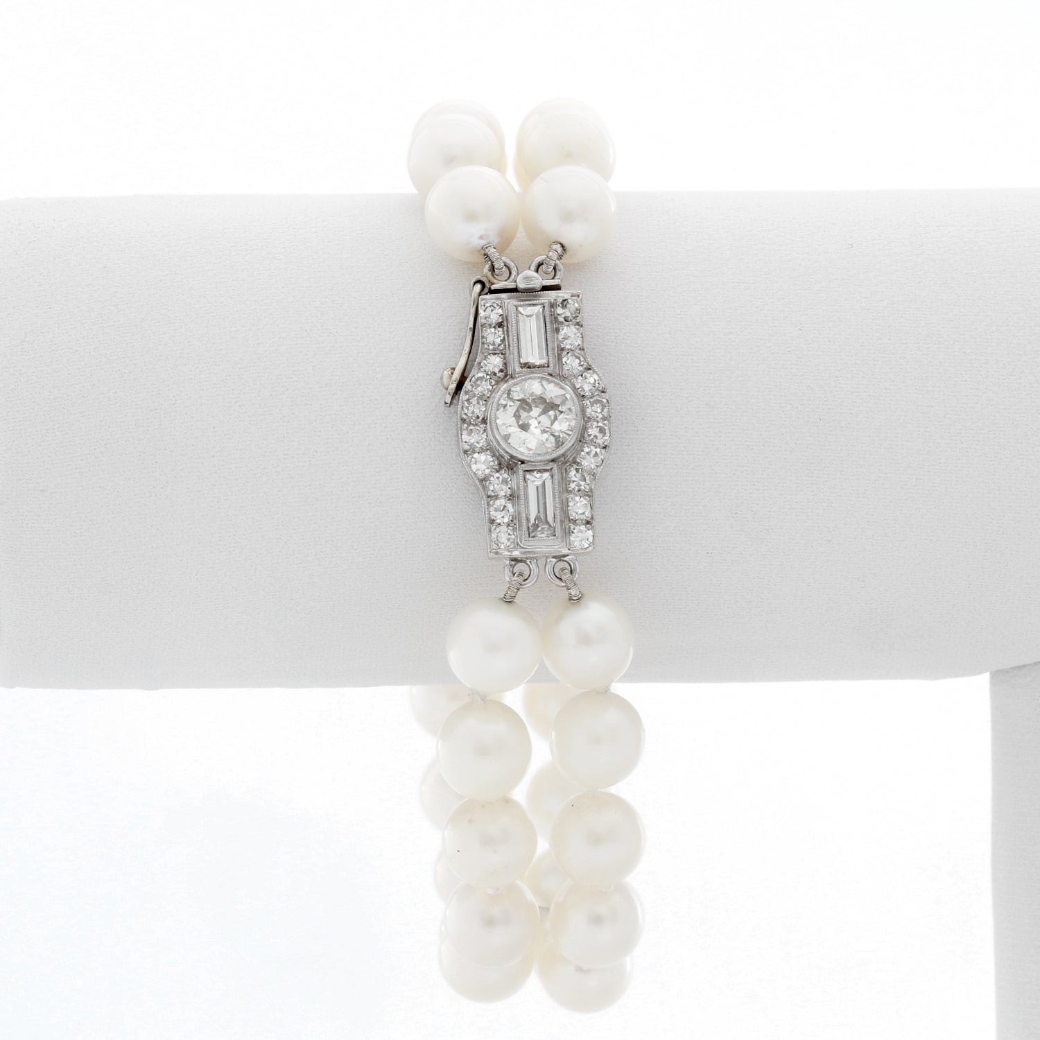 Double Strand Pearl Bracelet With Diamonds - Art deco style bracelet with 2 strands of pearls and an oversized diamond clasp. Bracelet measures approx. 6 1/2 inches with approx. 1 ct of diamonds. Pre-Owned .