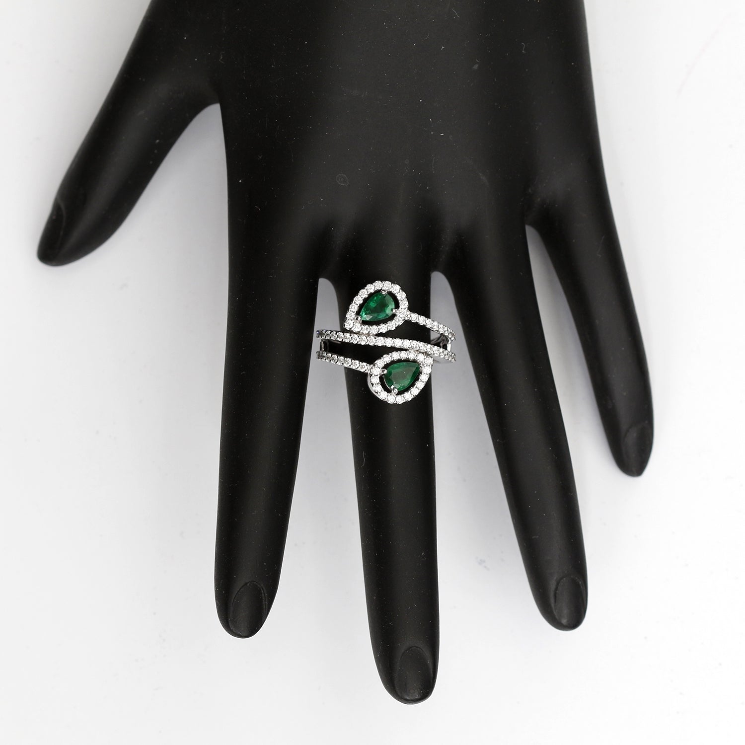 This charming composition balances a pair of pear-shaped color stones along detailed diamond accents at every glance. With 0.79 cts of Emerald pear-shaped stone suspended by diamond halo. Total diamond weight 0.61 cts. Total weight 4.9. Size 7.