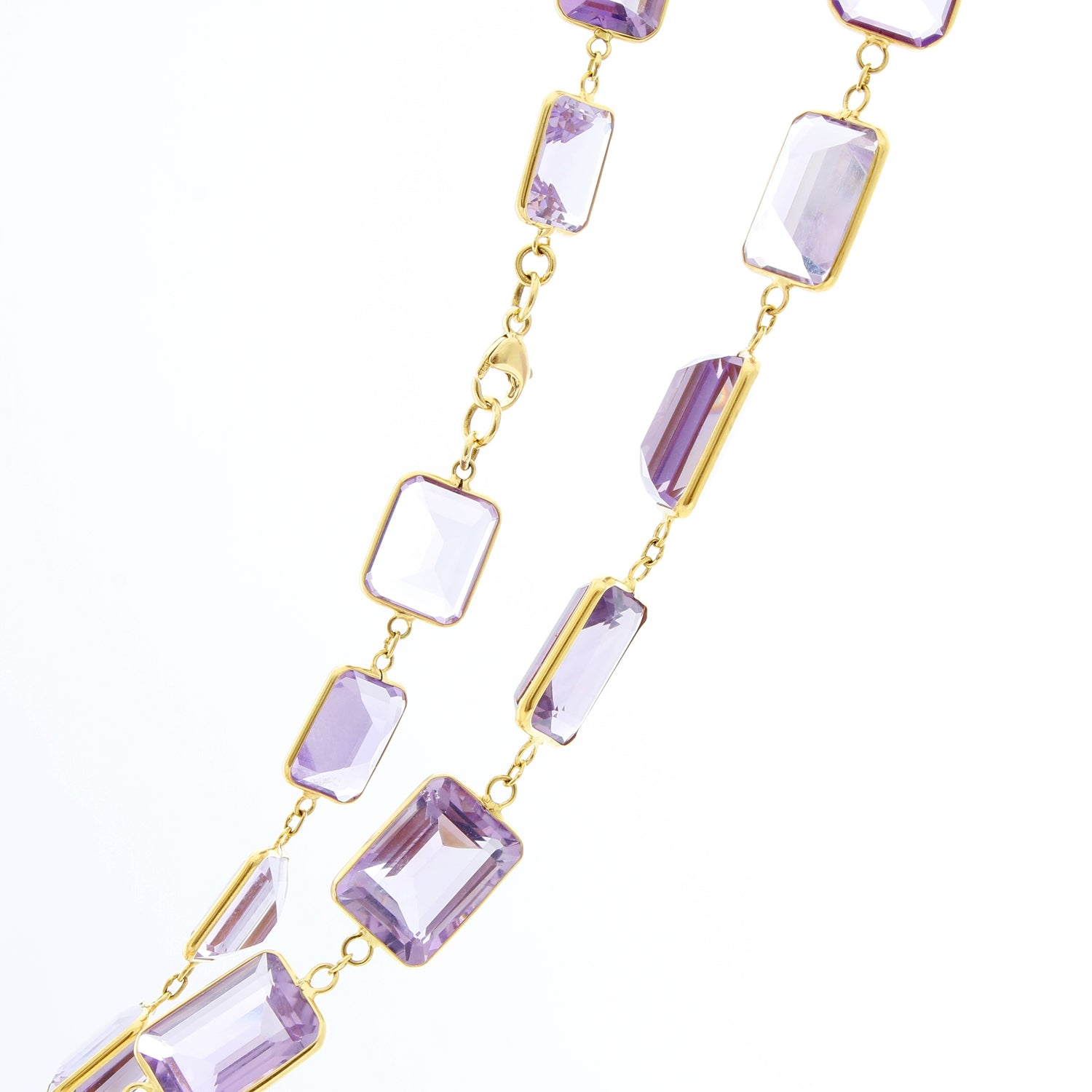 Light Purple Amethyst Necklace - Dazzle in this light purple amethyst necklace that measures 18 inches long and has 40 stones. Holding everything together is 18k yellow gold. Approx 283 total ct weight. This necklace is unworn comes with a DeMesy box.
