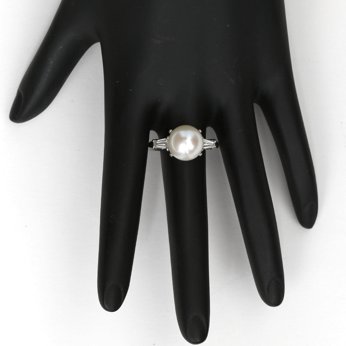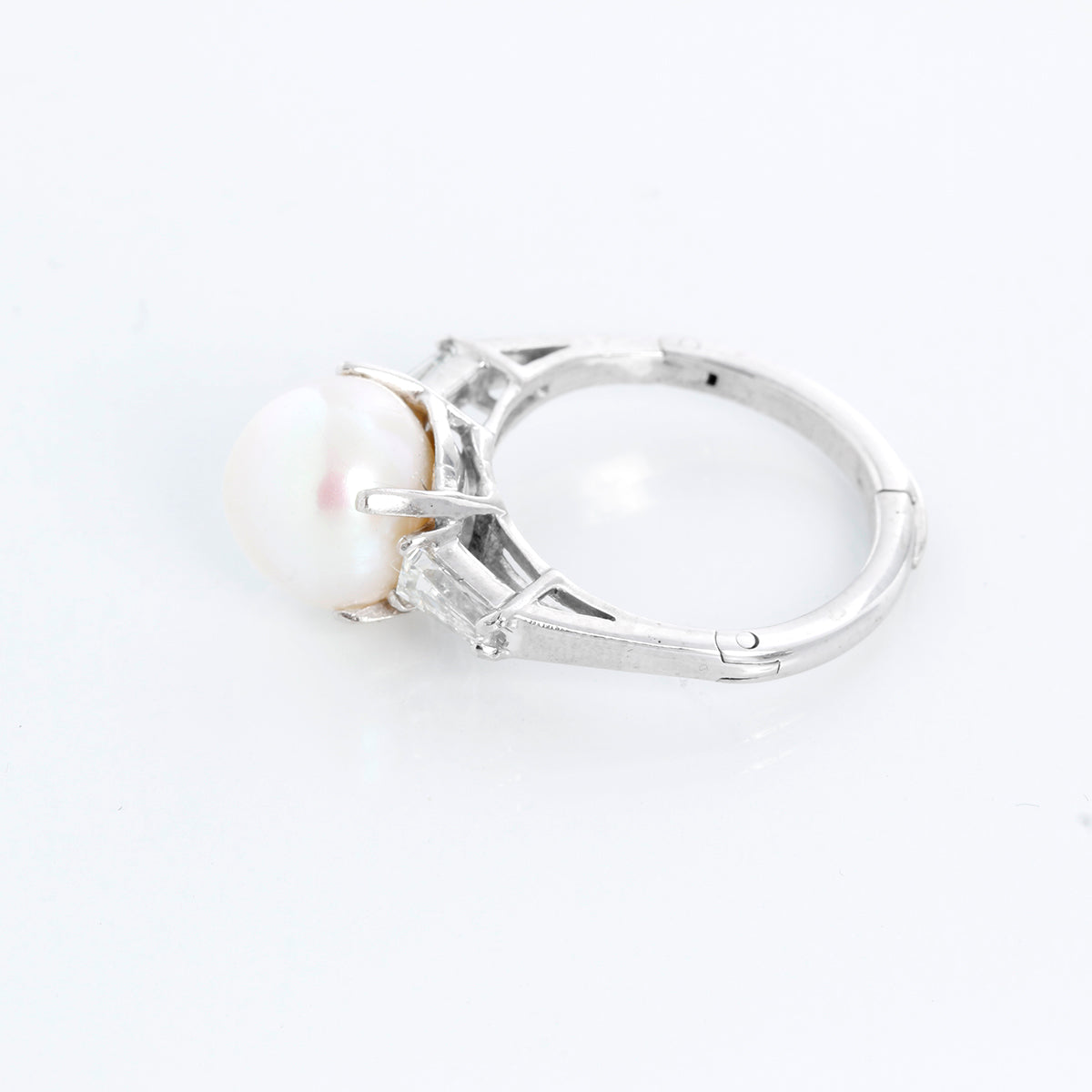 Platinum Pearl and Diamond Ring - A stunning 11mm pearl sits on this platinum ring and is enhanced by tapered baguettes on both sides. Approx total diamond weight is .50 ct. The ring has an extender on the bottom part to go up in size. Total weight is 6.80 grams and is a size 8 1/2. Pre-Owned with box.