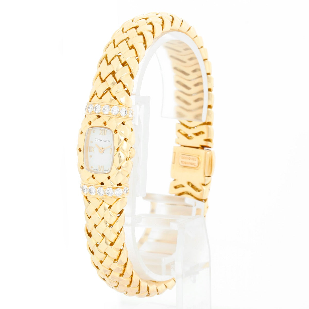 Tiffany & Co. Ladies Vannerie 18K Yellow Gold Watch 12.0504 - Quartz. 18K Yellowy gold case with diamond bands on each end of watch ( 15 x 22mm); Sixteen diamonds total. White dial with gold Roman numerals at 12, 3, 6 and 9; Signed Tiffany & Co.. Lattice design 18K Yellow gold bracelet signed Tiffany & co.; The clasp is stamped "Tiffany & Co., 750 1995. Measures a 7 1/4 inch wrist . Pre-owned with Tiffany box and papers. Dated 2000. Total weight 78.3 grams.