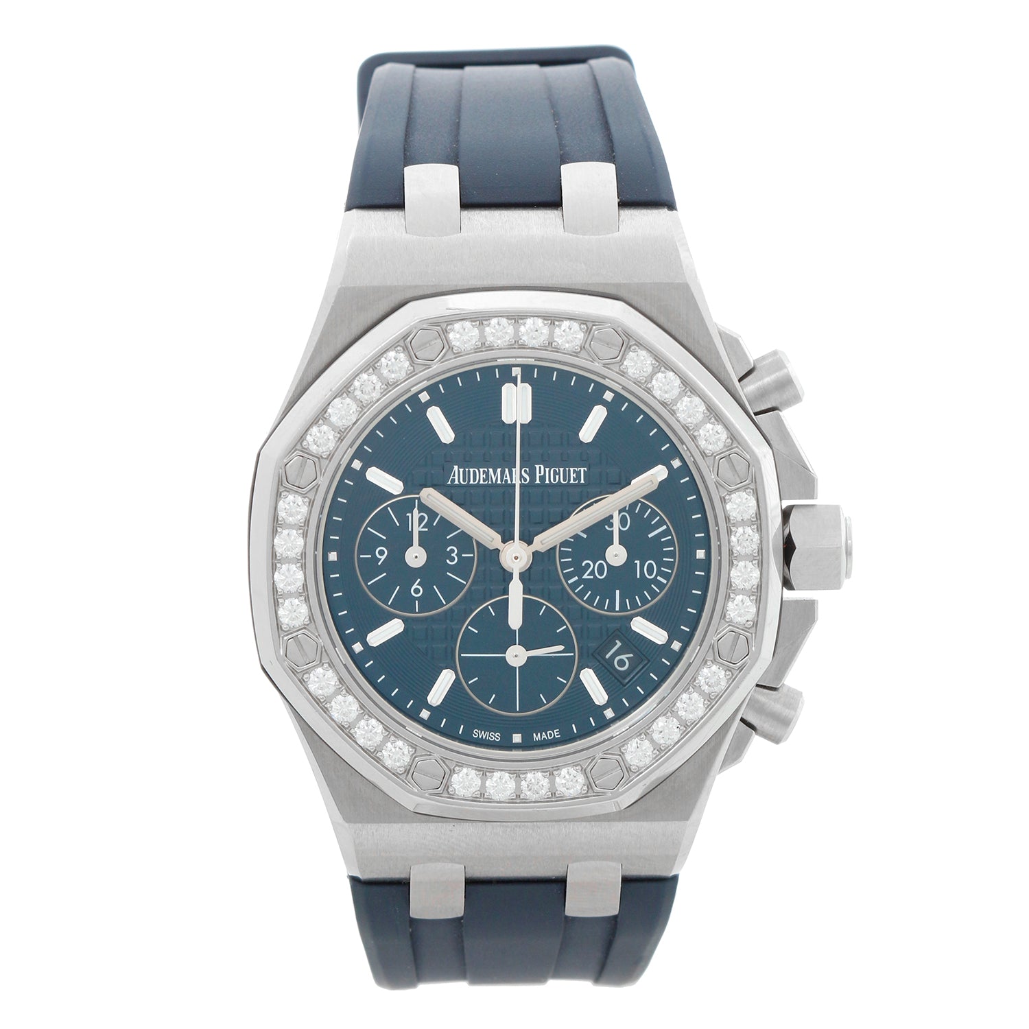 Audemars Piguet Royal Oak Offshore 26231ST.ZZ.D027CA.01 Ladies Automatic Stainless Steel Chronograph - Automatic winding, Caliber 2385. Royal Oak Offshore. Stainless Steel case ( 37mm diameter) with factory diamond bezel. Blue tapisserie dial. AP rubber strap with AP deployant clasp. Pre-owned with box,card and books. #64593
