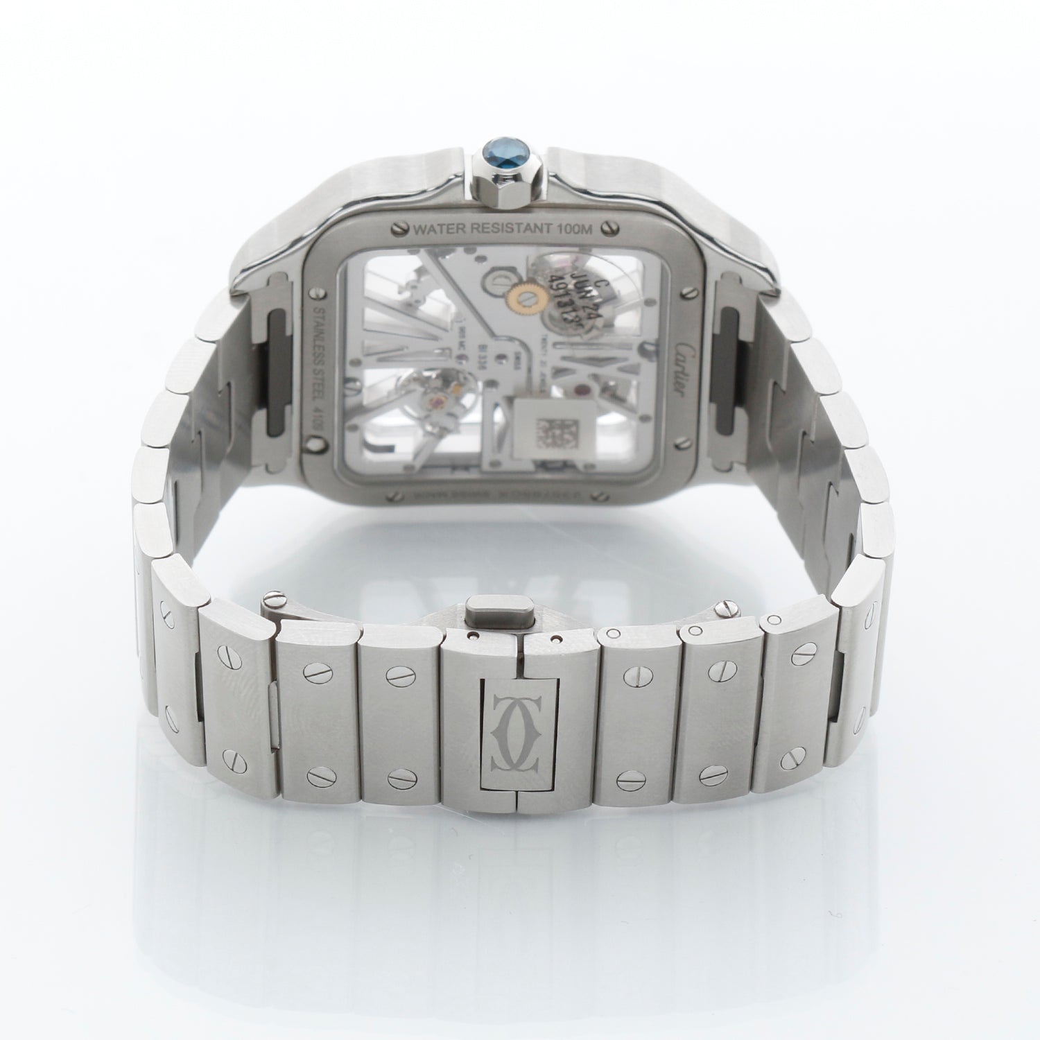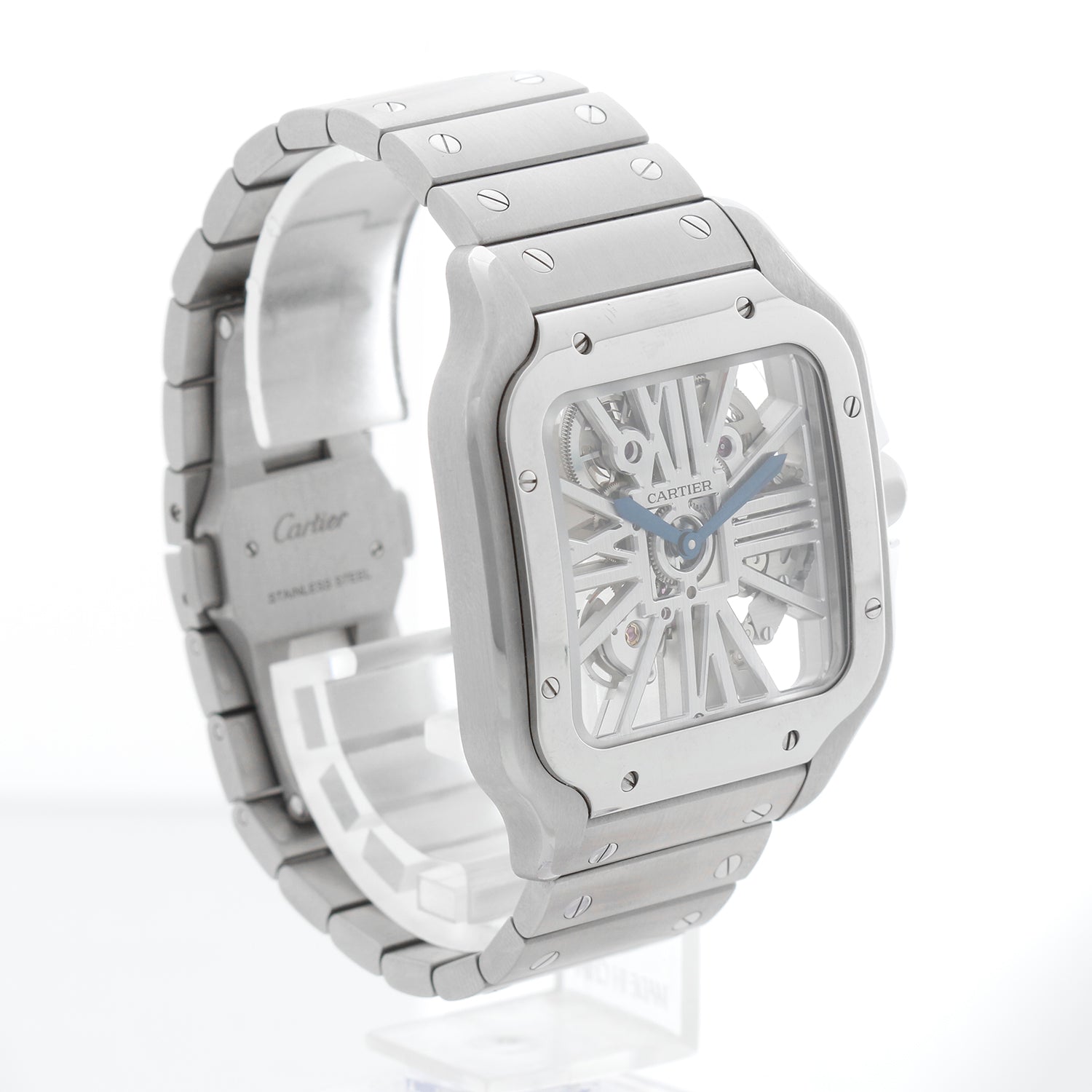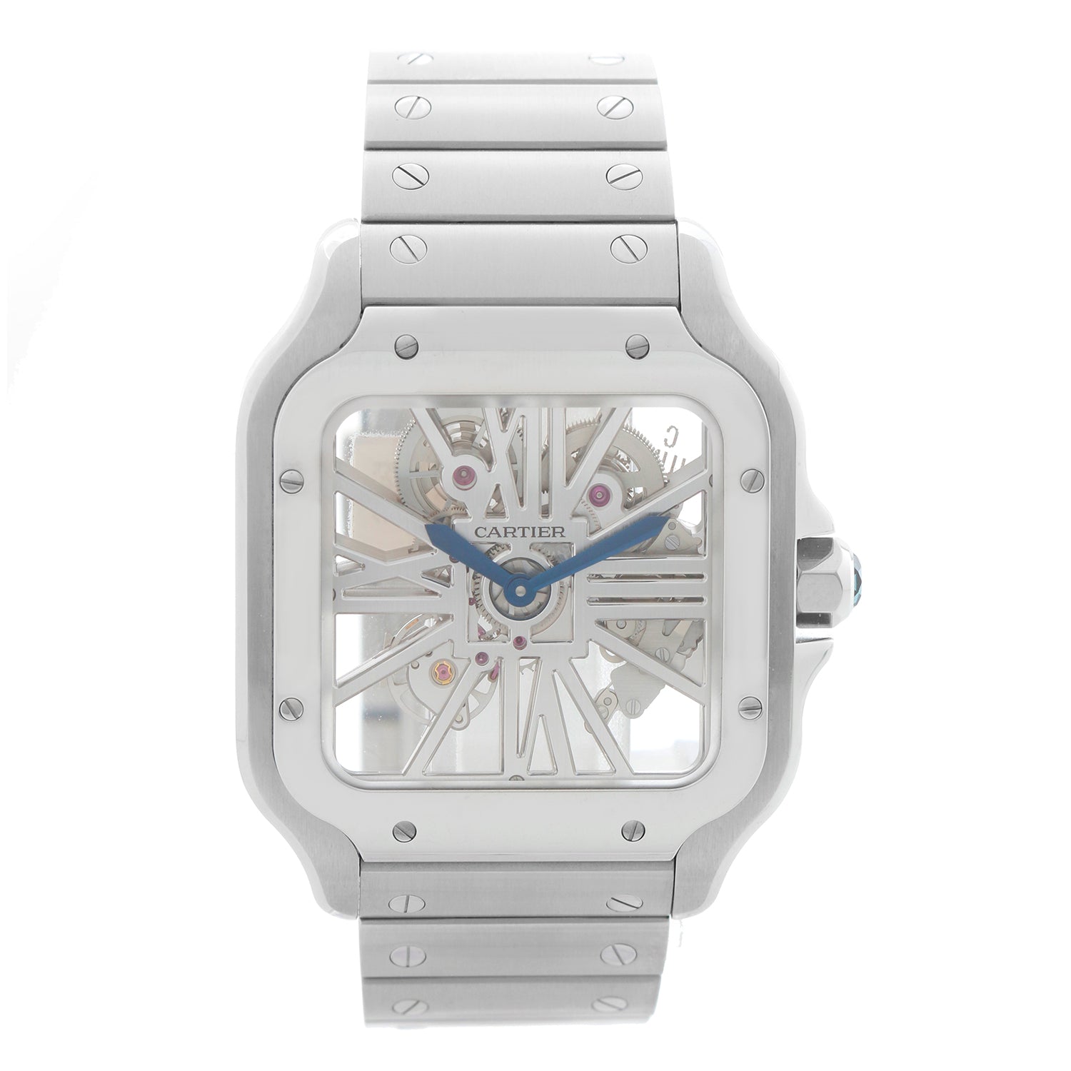 Cartier Santos de Cartier Skeleton Stainless Steel Watch WHSA0015 4109 - Manual movement. Santos de Cartier. Stainless Steel Case with smooth bezel ( 40 x 47 mm). Skeleton Dial. Stainless Steel Santos bracelet and extra blue rubber strap with deployant buckle. Pre-owned with Cartier box and card. Dated 2022. Still has an active Cartier warranty.