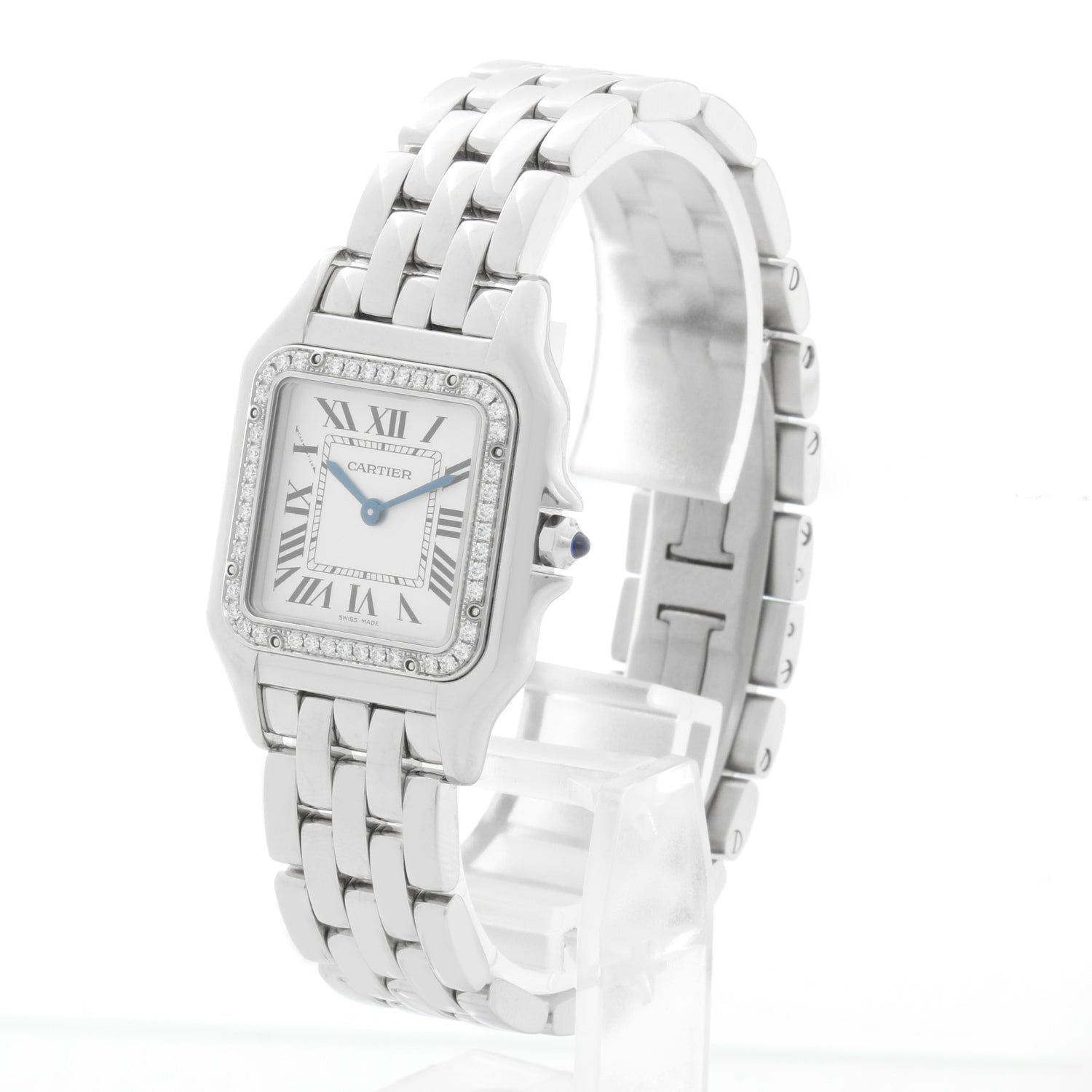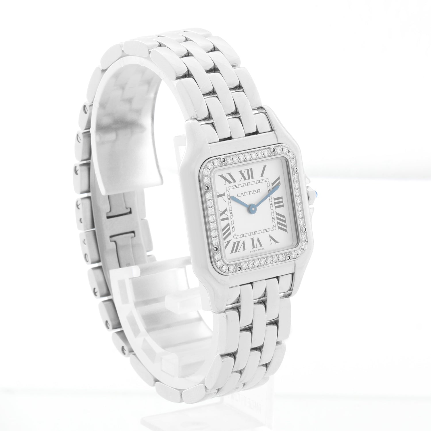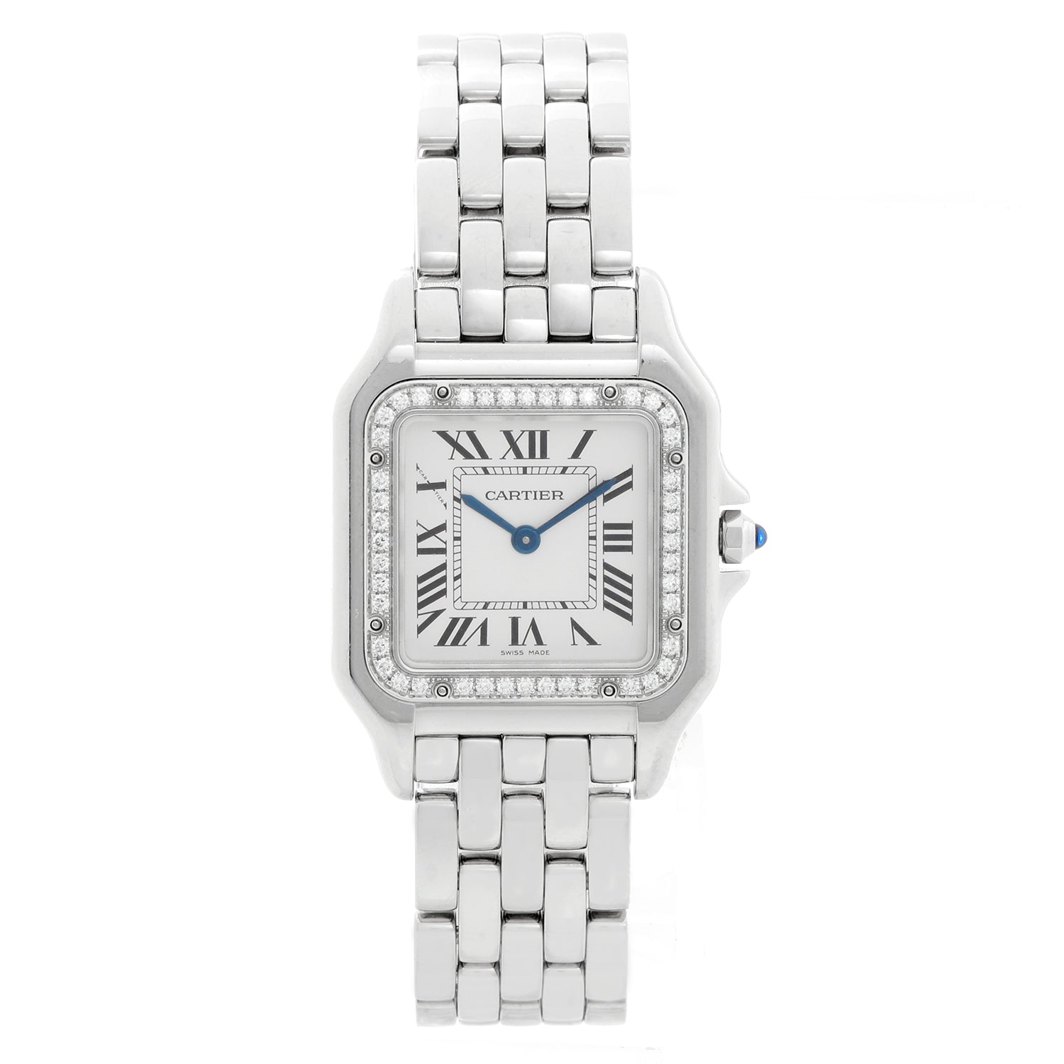 Cartier Stainless Steel Midsize Diamond Panther W4PN0008 4016 - Quartz. Panthere. Stainless Steel with factory diamond bezel ( 27 x 37 mm ). Silver dial with black roman numerals. Stainless steel bracelet; will fit up to a 6 1/4 inch wrist. Pre-owned with Cartier box and card. Dated 2021. Still has an active Cartier warranty.