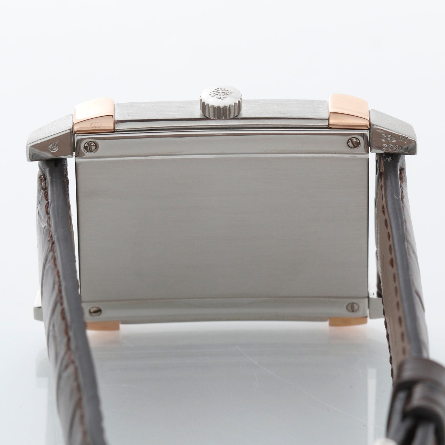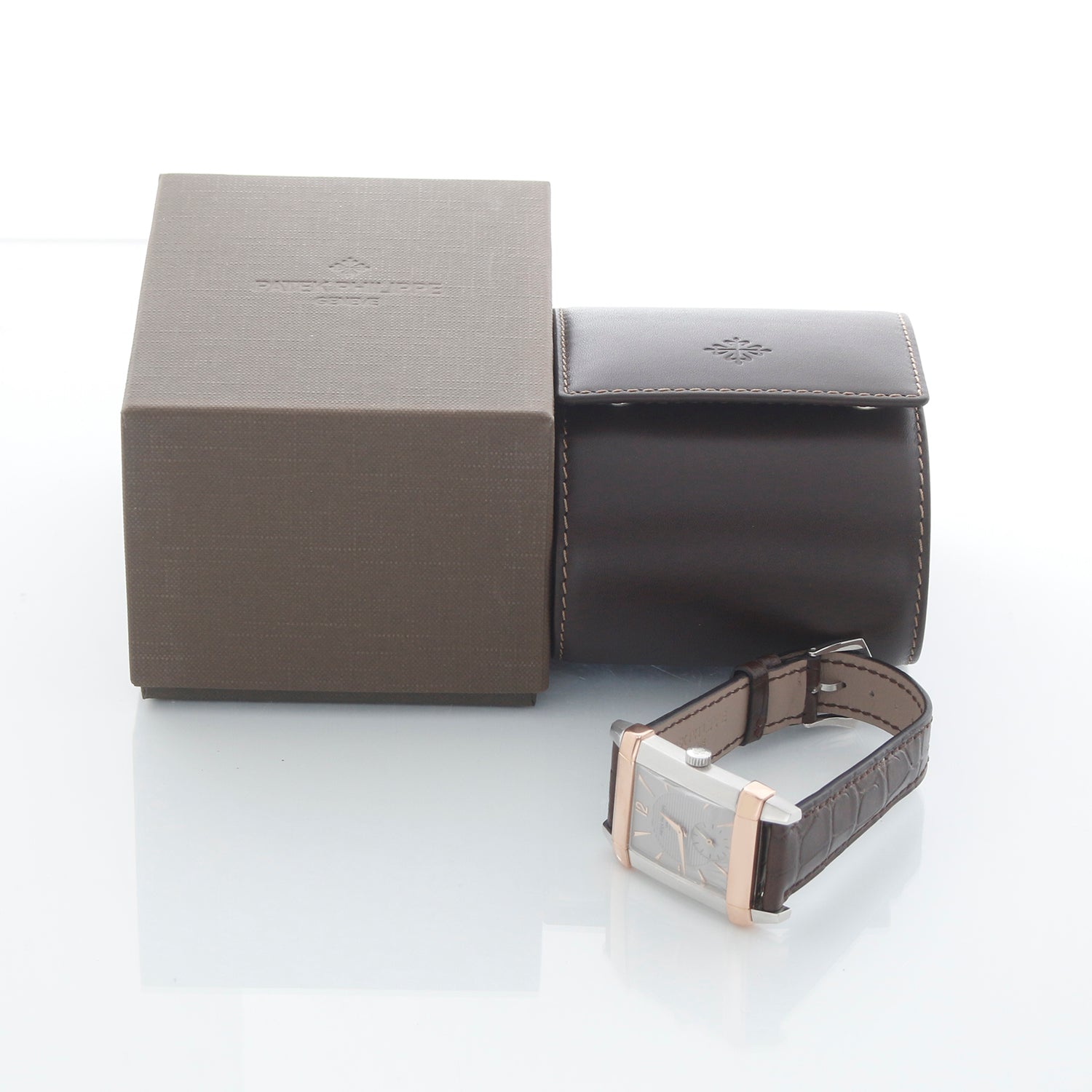 Patek Philippe Gondolo Men's Platinum & Rose Gold Watch 5111PR (or 5111 PR ) - Manual winding. Two-tone platinum and Rose gold (30mm x 47mm). 2-Tone silver colored dial with rose gold markers and seconds subdial. Patek Philippe brown strap and platinum Patek Philippe buckle. Pre-owned with Patek Philippe travel box and Archive papers on order
