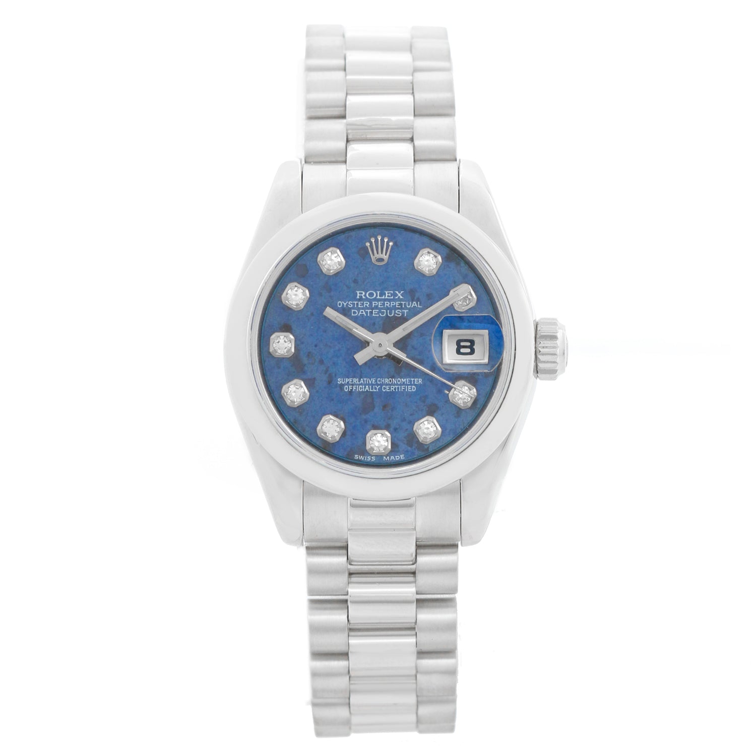 Rolex Ladies Platinum President 179166 - Automatic winding, Quickset date, sapphire crystal. Ladies President. Platinum case with smooth bezel (26mm). Sodalite Diamond dial. Platinum President bracelet with hidden clasp. Pre-owned with Rolex Box.