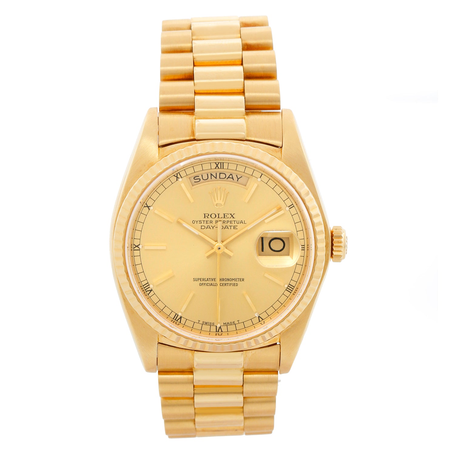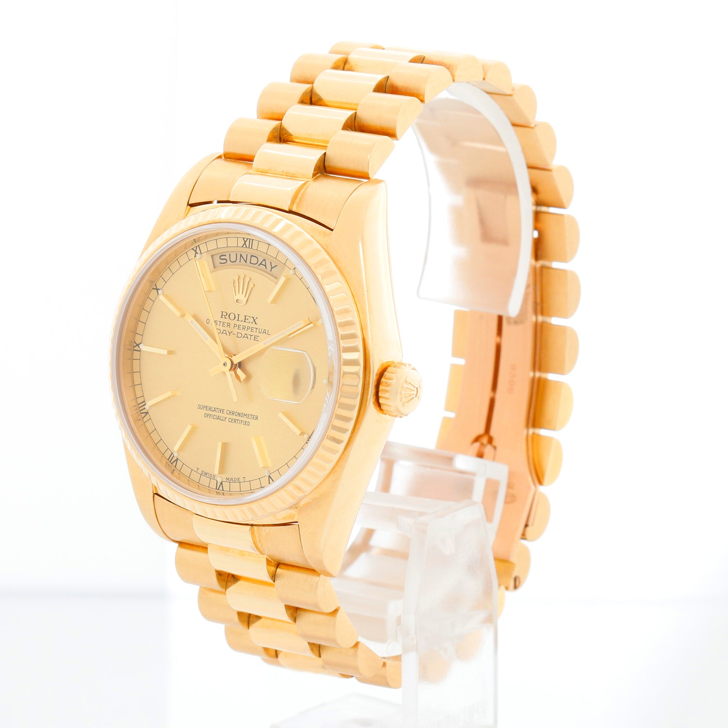 Rolex President Day-Date Men's 18k Gold Watch 18038 - Automatic winding; quick-set; sapphire crystal. 18k yellow gold case with fluted bezel (36mm diameter). Champagne dial with stick markers. 18k yellow gold hidden-clasp President bracelet. Pre-owned with Rolex box and books.