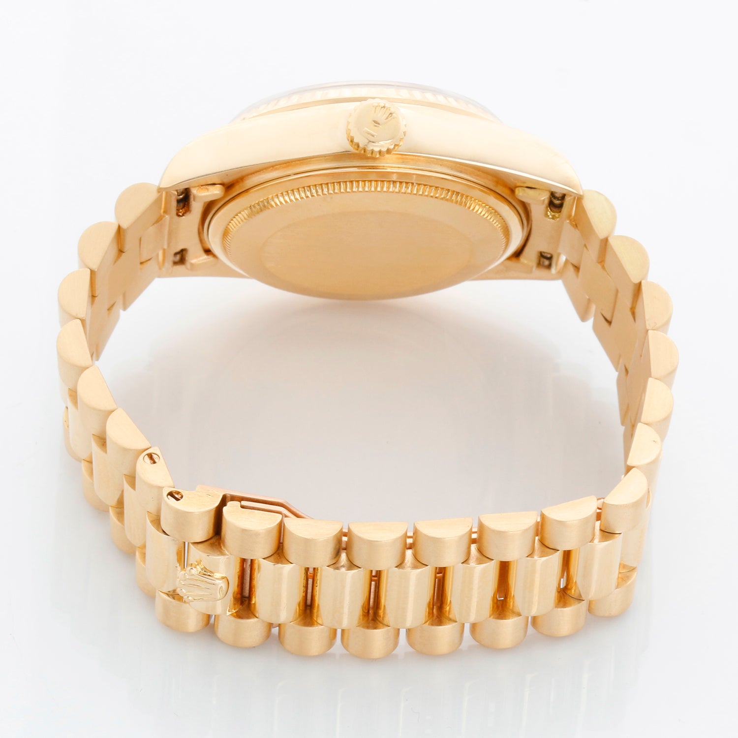 Rolex President, Day-Date - Model 18038 - Men's automatic winding wristwatch. 18k yellow gold case with fluted bezel (36mm diameter). Silver dial with stick markers. 18k yellow gold hidden-clasp President bracelet. Pre-owned with Rolex travel box.