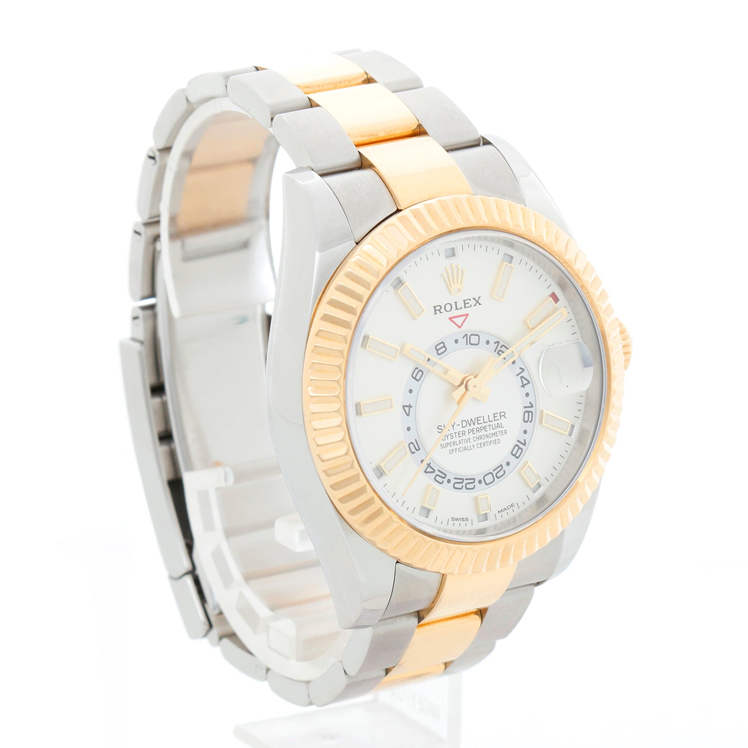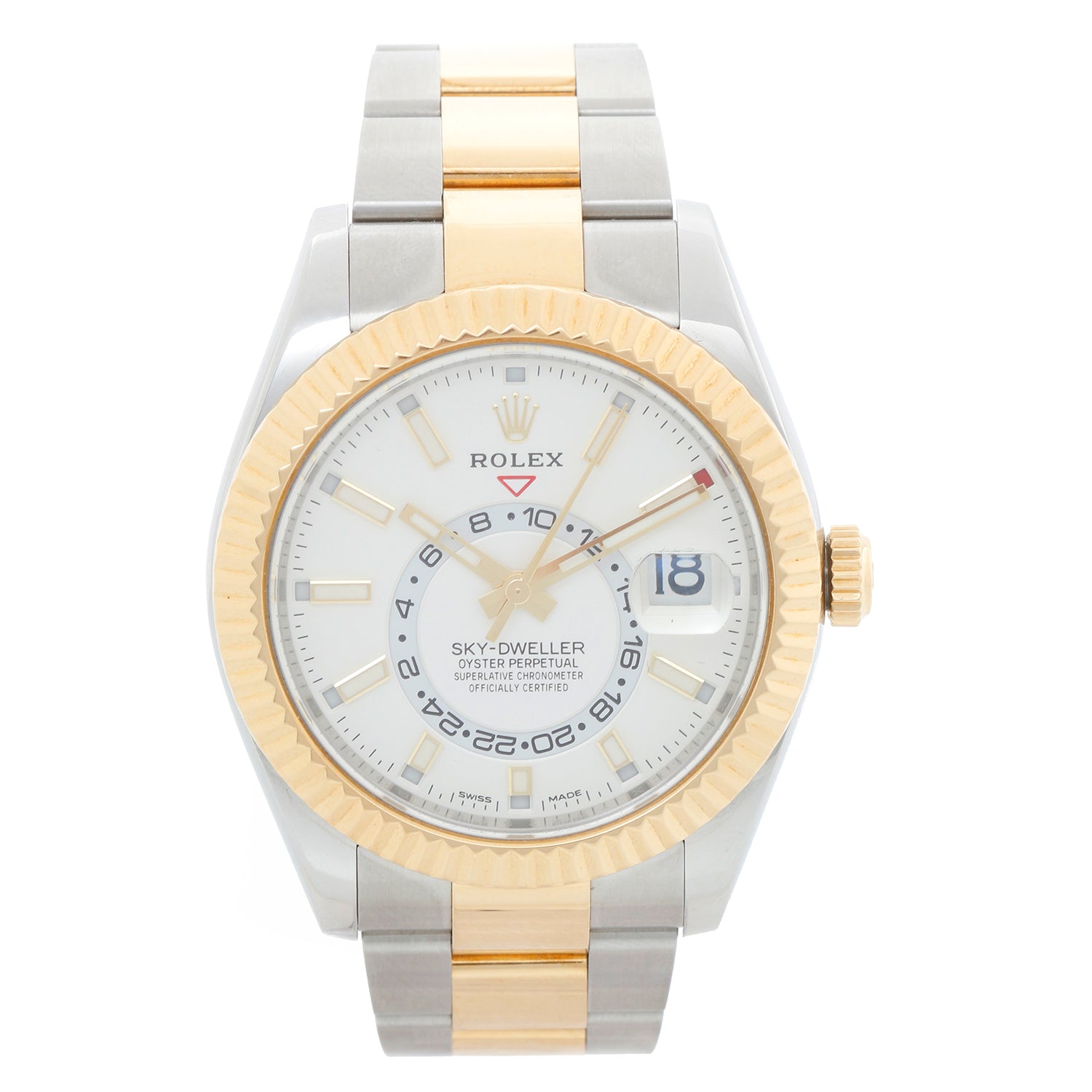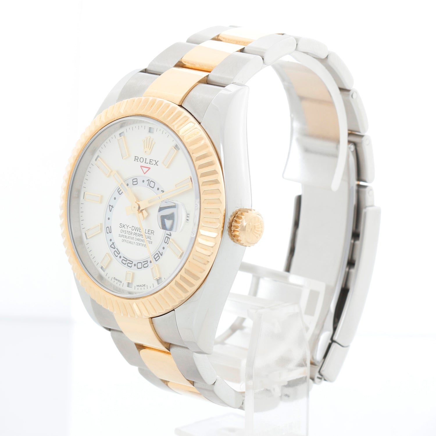 Rolex Sky-Dweller Stainless Steel and Yellow Gold Men's Watch 326933 - Automatic, Quickset. Sky-Dweller. Stainless Steel and 18K Yellow gold with 18K gold fluted bezel ( 42 mm ). Silver dial with index hour markers; date, second timezone. Stainless steel and 18K Yellow gold oyster with folding clasp. Pre-owned with Rolex box and card. Dated 2019.