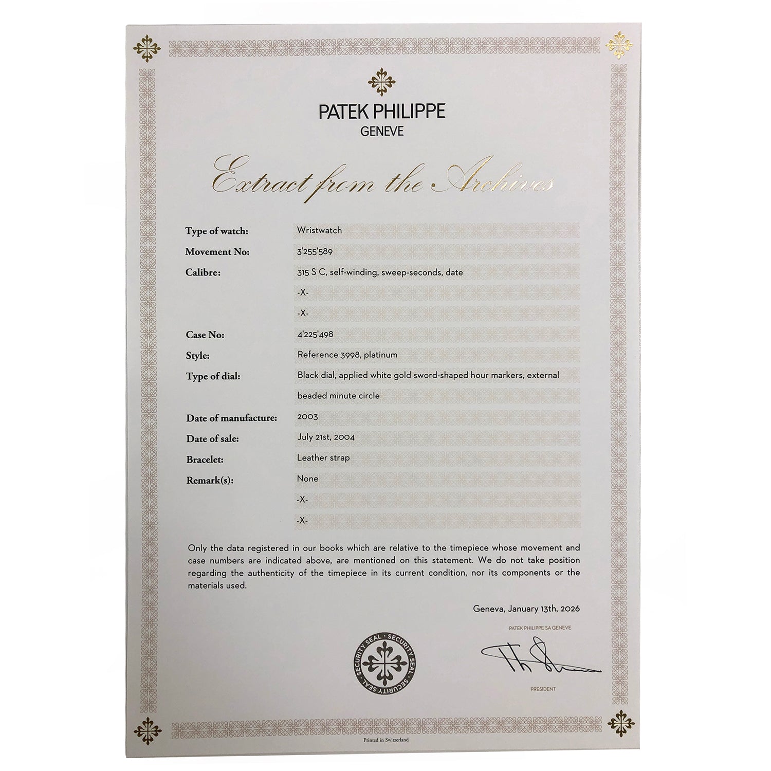 Very Rare Patek Philippe Calatrava Platinum Ref 3998 P Men's Watch - Automatic; Sapphire Crystal. Platinum ( 34 mm ) screw back case with Platinum smooth bezel. Black dial with steel hands and index hour markers. Minute markers on the outer dial. Date display at the 3 o'clock position. Black leather Patek Philippe strap with 18K white gold buckle. Pre-owned Patek Philippe travel box. Very rare and hard to find in platinum. Archives on order