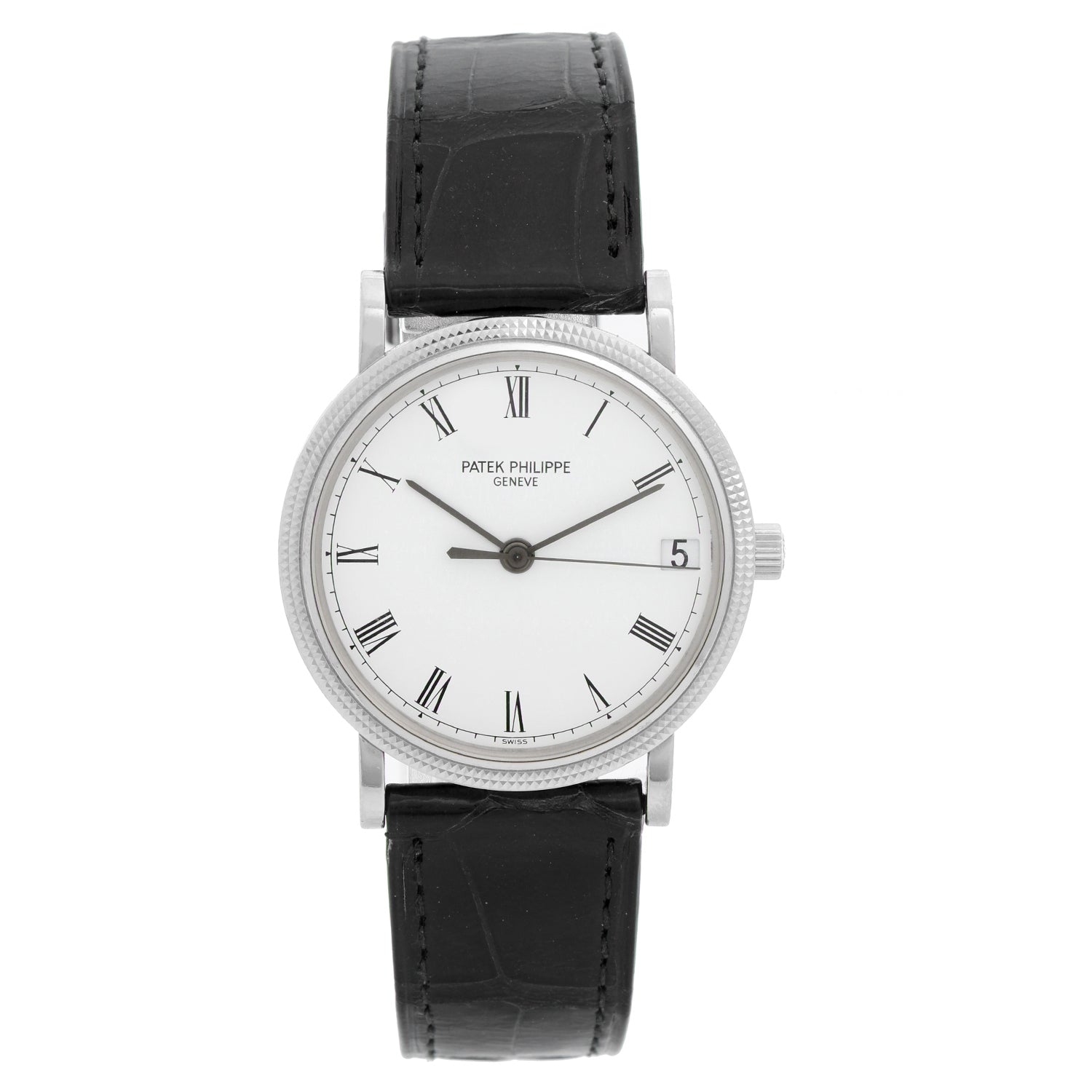 Patek Philippe Calatrava 18k White Gold Men's Watch 3802 - G - Automatic winding. 18k white gold case with hobnail bezel (33mm diameter). White dial with black Roman numerals; date at 3 o'clock. Black leather band with tang buckle. Pre-owned with Patek box.