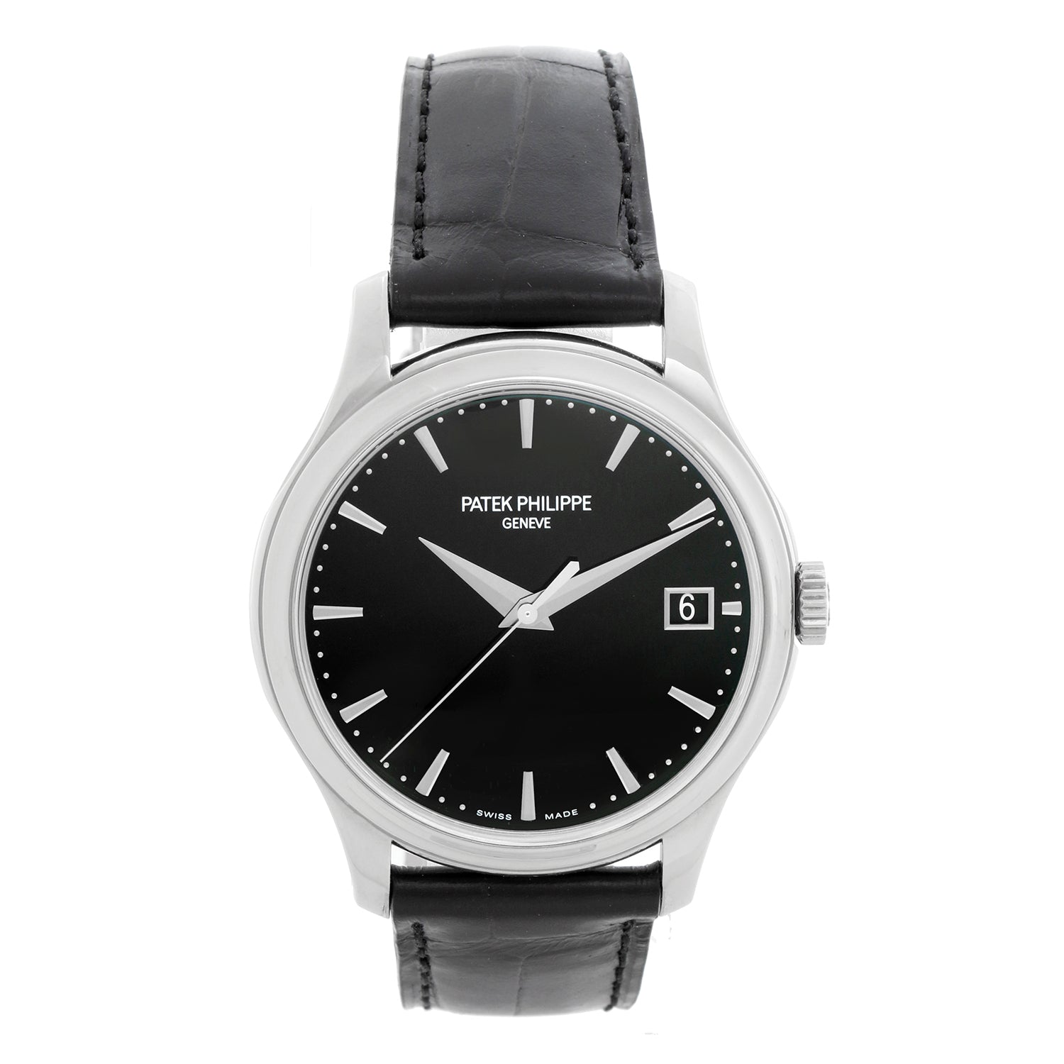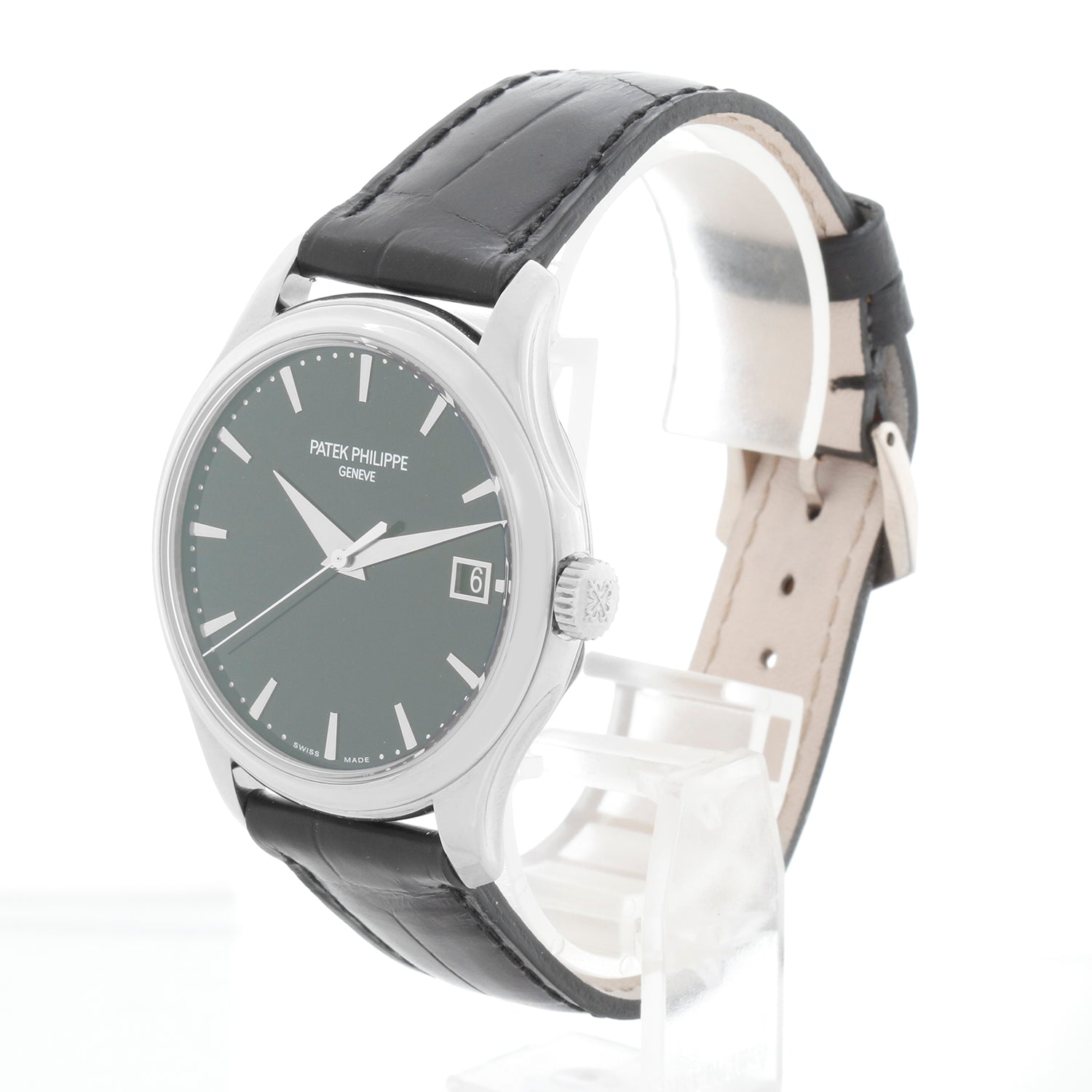 Patek Philippe Calatrava 18k White Gold Men's Automatic Watch 5227G - Automatic winding with date at 3 o clock. Calatrava. 18K White gold case with smooth bezel (38 mm) Exhibition back. Black dial with raised white gold markers. Black Patek Philippe strap band with white gold tang buckle. Pre-owned with Patek Philippe travel box. Original Patek Philippe archive papers can be ordered for additional $650.