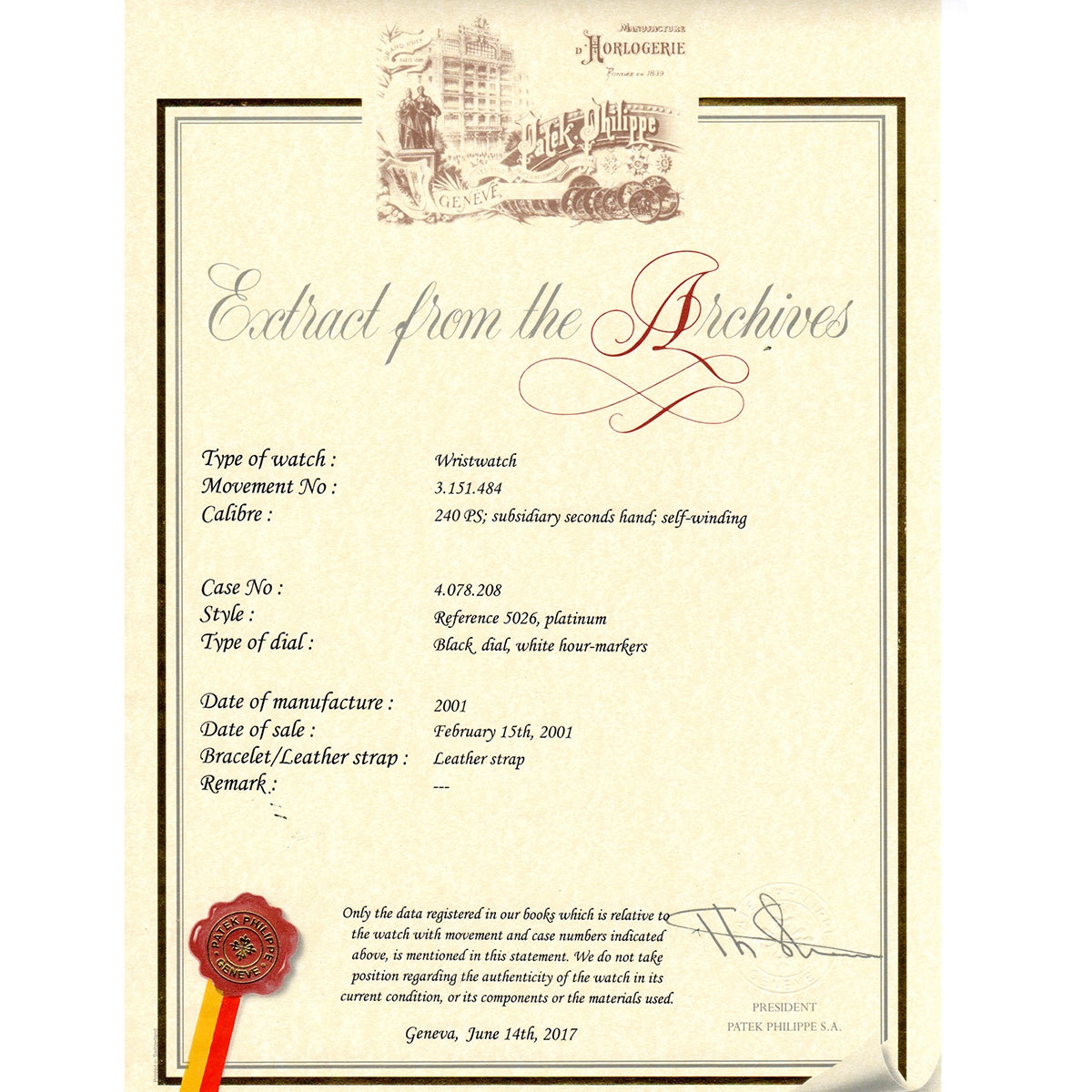 Patek Philippe Calatrava Men's Platinum Watch 5026 P - Automatic winding. Platinum case with exposition back (34mm diameter). Black dial with Roman numerals; seconds subdial at 4 o'clock. Strap band with Platinum Patek Philippe buckle. Pre-owned with Patek box and Archive papers.