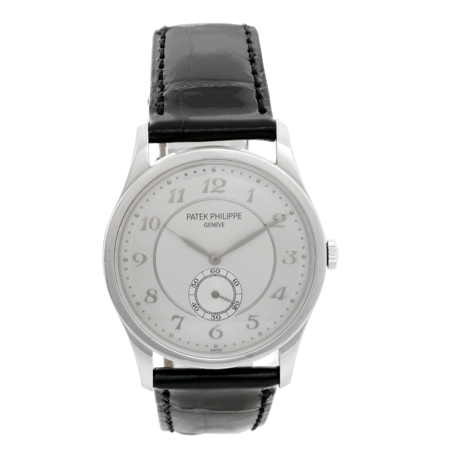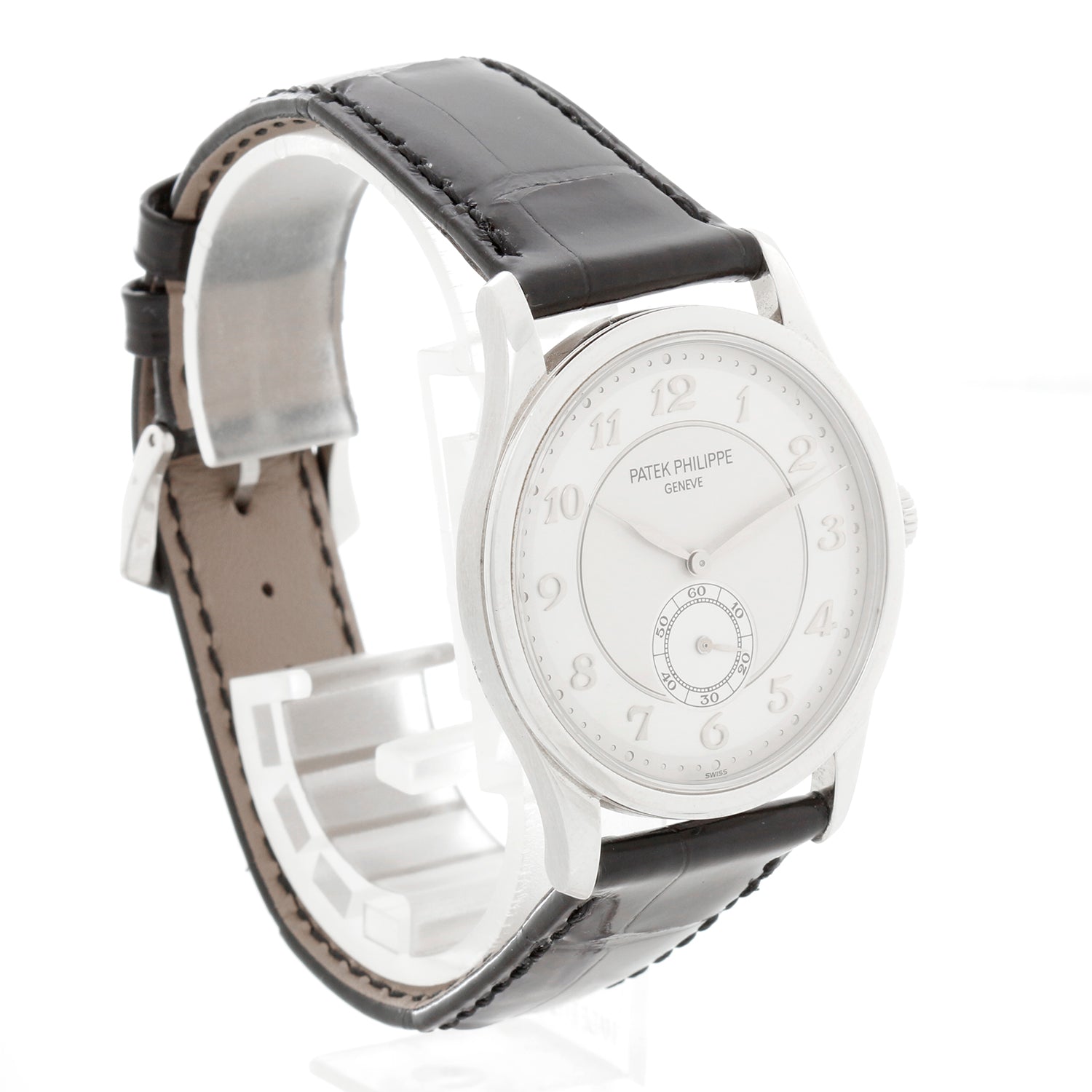 Patek Philippe Calatrava Platinum Ref. 5196 P - Manual winding. Calatrava. Platinum with 1 diamond approx. .02 ct (37mm diameter). Two-tone silvered dial with applied White Gold numerals. Black Patek Philippe strap band with Platinum tang buckle. Pre-owned with Patek Philippe travel box and Archive papers. Dated 2006.