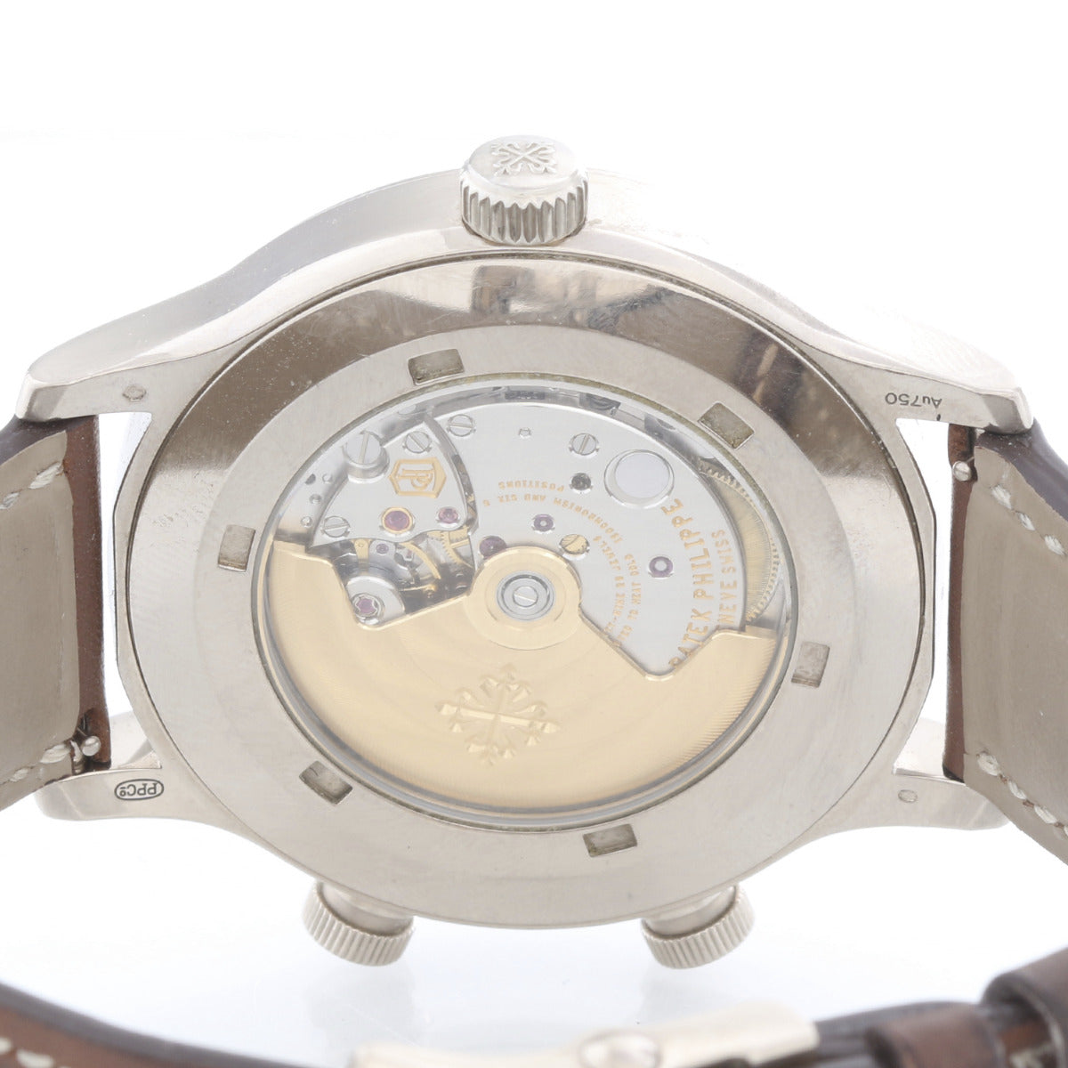 Patek Philippe Calatrava White Gold Pilot Travel Watch Ref. 5524 G - Automatic self-winding movement.. 18k White gold case (42 mm). Exhibition sapphire crystal case back. Blue varnished dial with luminous sword-shaped hands and Arabic numeral hour markers. Date display at the 6 o'clock position. Brown calf leather strap with 18K white gold tang buckle.. Pre-owned with Patek box and papers.