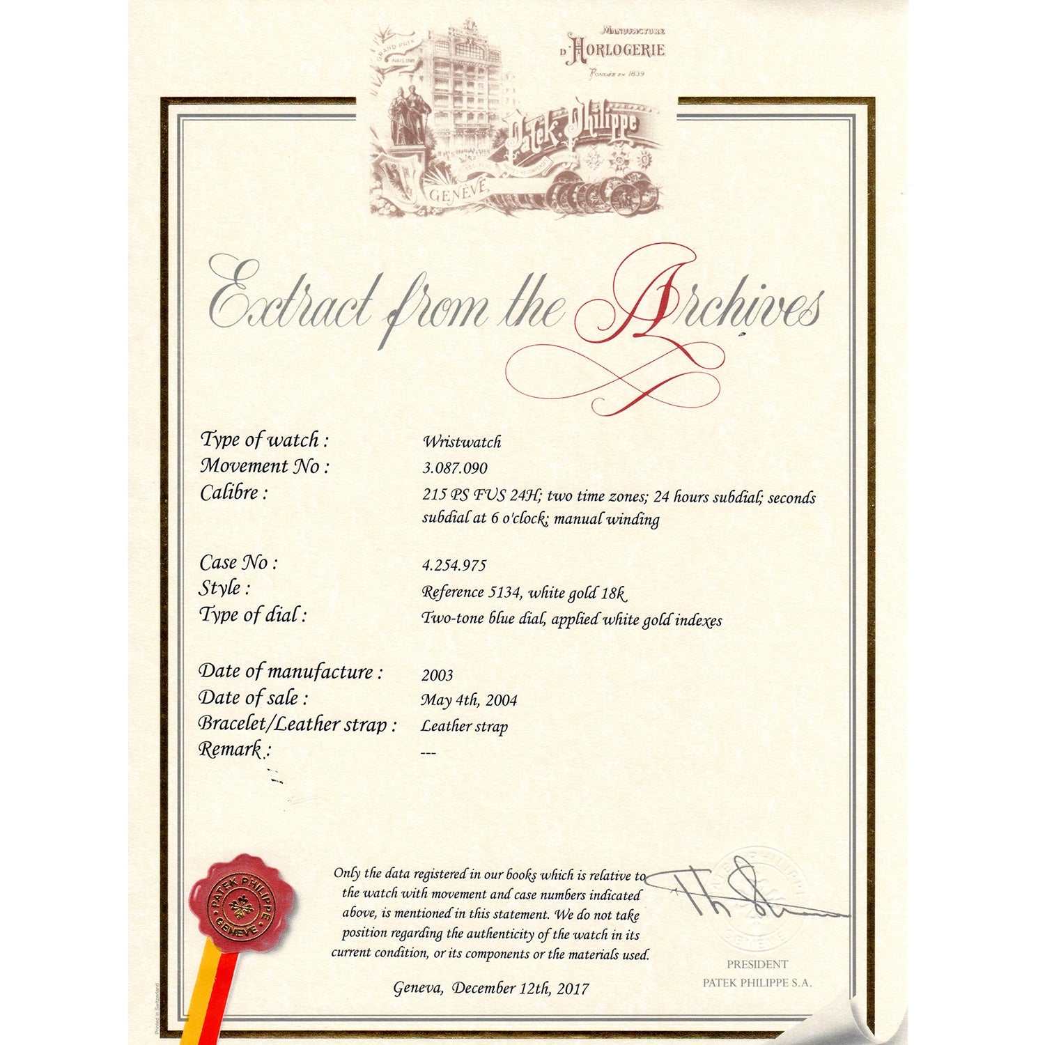 Patek Philippe & Co. Calatrava Travel Time 150th Anniversary of Gubelin Ref 5134 – Very rare watch with only 45 pieces made in white gold with blue dial. 150 pieces in total with different cases. The watch is manual, with an 18k White Gold case ( 37mm ) . Two tone unique guilloche dial for the second time zone adjusted by two push buttons in the band. Water-resistant type screw-down sapphire crystal display back to reveal the movement. Sapphire crystal printed with Gublein logo and Gubelin 1854-2004 inscription. Case, dial, and movement signed Patek Philippe. Dial signed Gubelin. Pre-owned with Patek Archive papers. To the best of our knowledge this is the only one offered online.