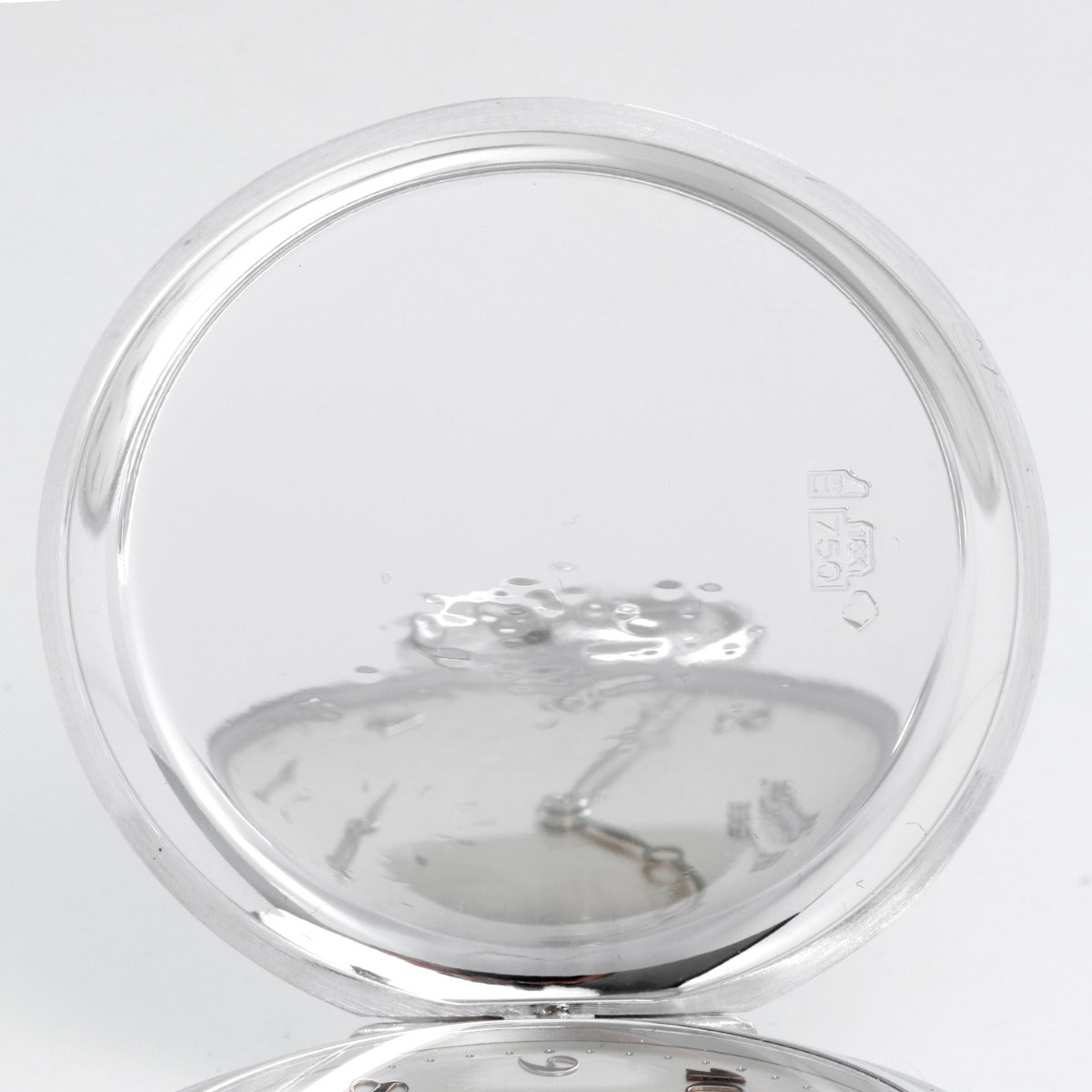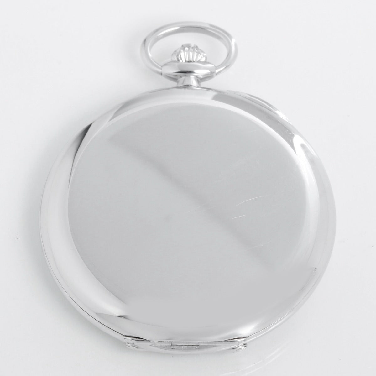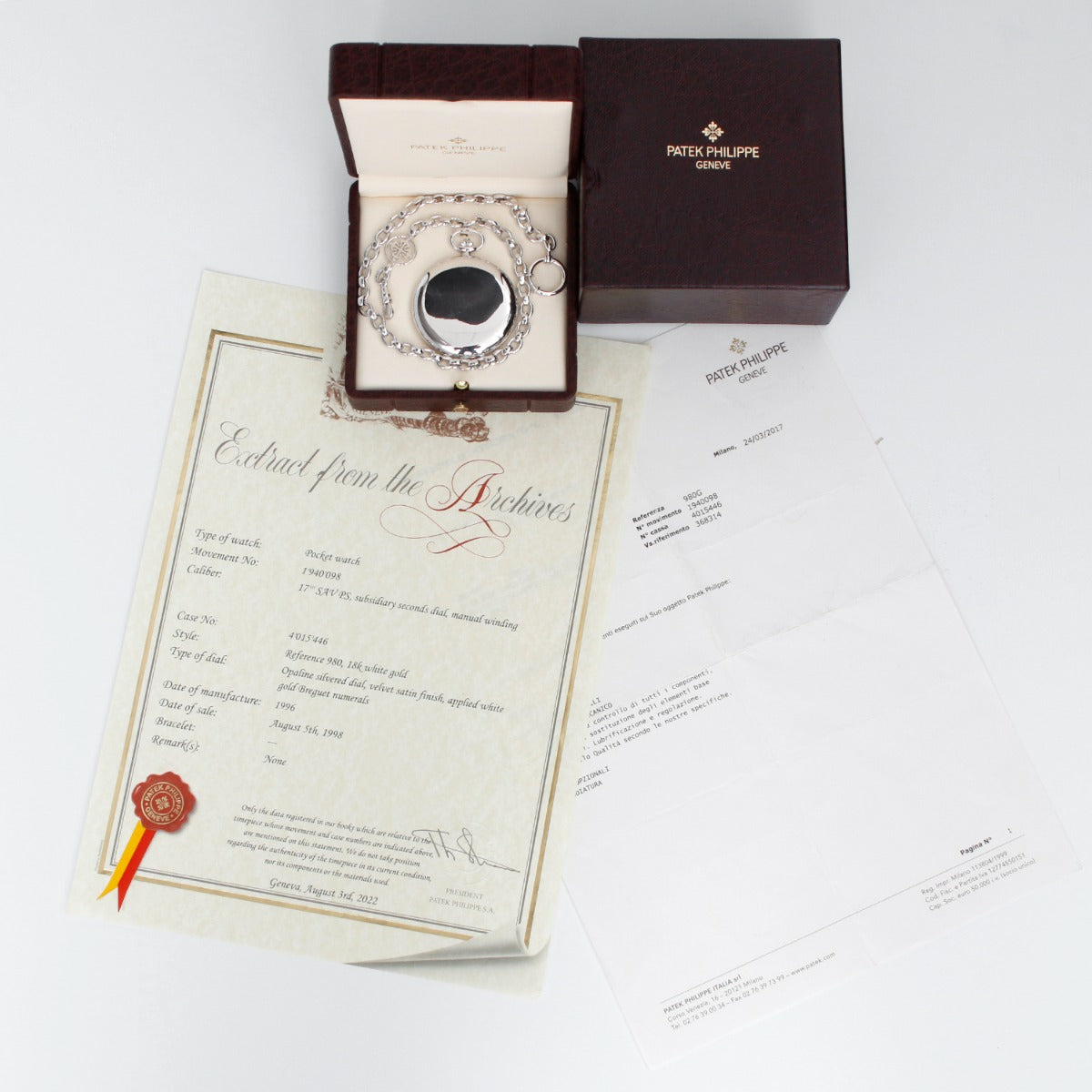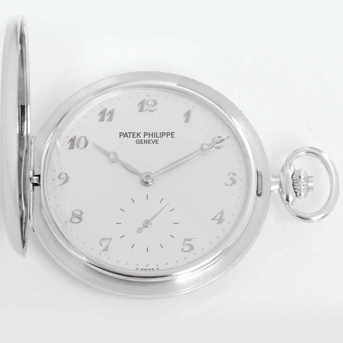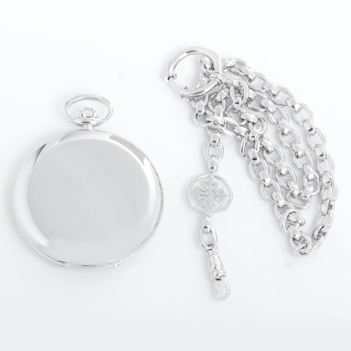Extremely Rare Patek Philippe Heavy Hunter Case 18K White Gold Pocket Watch - Manual winding. 18K White gold ( 48 mm ). Silver dial with applied white gold numerals. Comes as pictured with a matching 16-inch 18K white gold Patek Philippe marked chain, with its Patek Philippe Extract from the Archives noting a 1996 date of manufacture and a 1998 date of sale, and with papers from a 2017 servicing by Patek Philippe