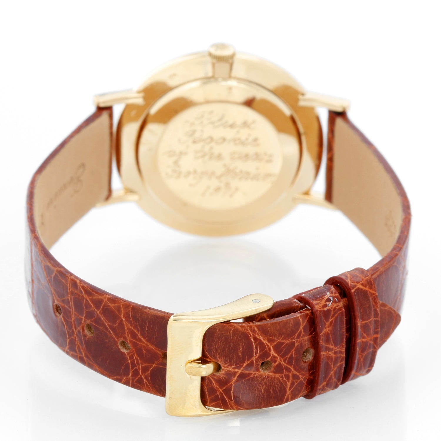 George Morrison's Rookie of the Year Patek Philippe Watch Ref. 3537 - Manual winding. 18k yellow gold case (33mm diameter) Case back inscribed " Blues Rookie of the Year George Morrison 1971". Silver dial with stick hour markers. Brand new brown leather strap with tang buckle. Pre-owned with custom box and O-Pee-Chee #223 George Morrison St. Louis Blues RC Rookie Hockey Card.