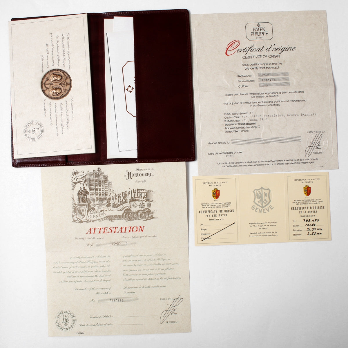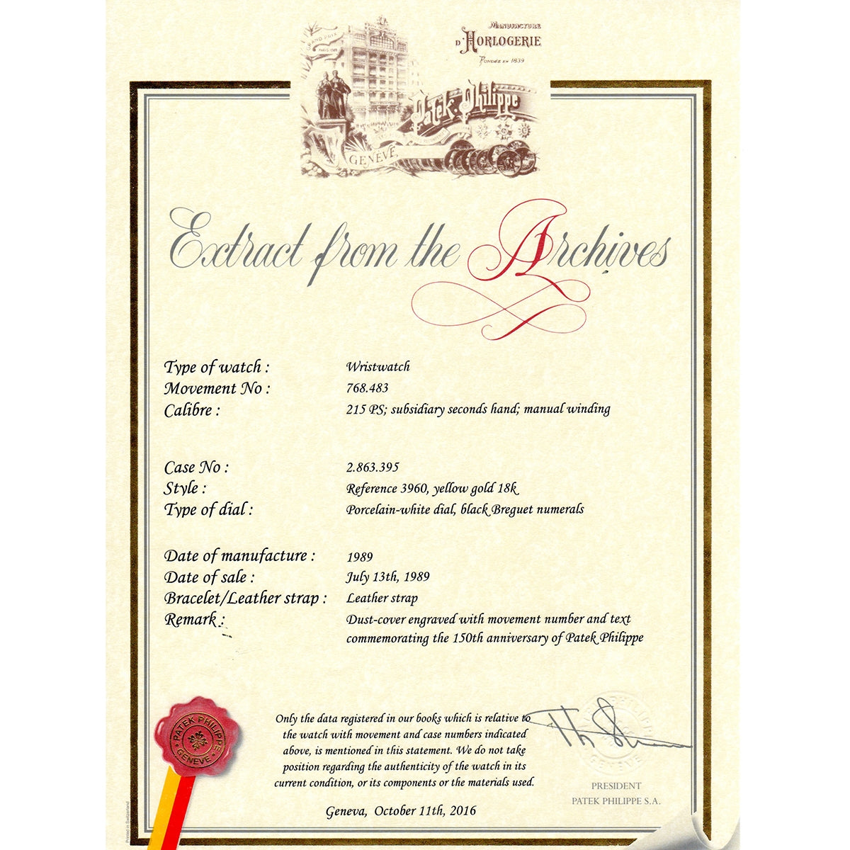 Patek Philippe 150th Anniversary Officers Watch 18k Yellow Gold with Hinged Back 3960 (or 3960J) - Manual winding. 18k yellow gold case with hinged back cover that opens to view display back with sapphire crystal (33mm diameter). White dial with Breguet numerals; date at 6 o'clock. Strap band with 18k yellow gold Patek buckle. This watch is in original unworn condition and still has original blue protective plastic on the case and includes the original Patek Philippe open papers & comemorative medal. This is the ultimate collectors watch due to its new old stock.