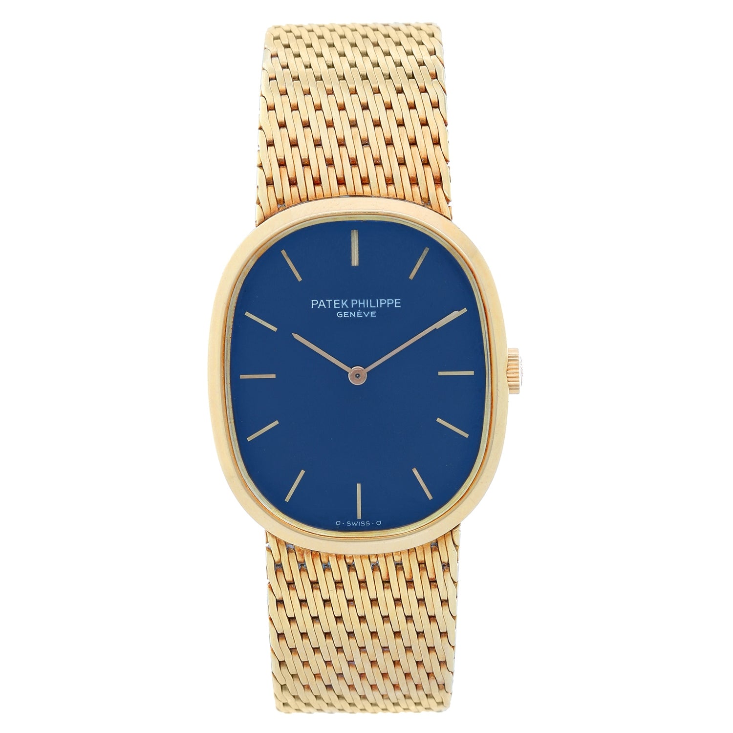Patek Philippe 18k Yellow Gold Ellipse Men's Watch Ref. 3848 - Manual winding. 18k yellow gold case (27mm x 32mm). Blue dial with gold stick markers. Yellow gold bracelet. Pre-owned with Patek Philippe box. This will fit a 6 3/4 inch wrist.