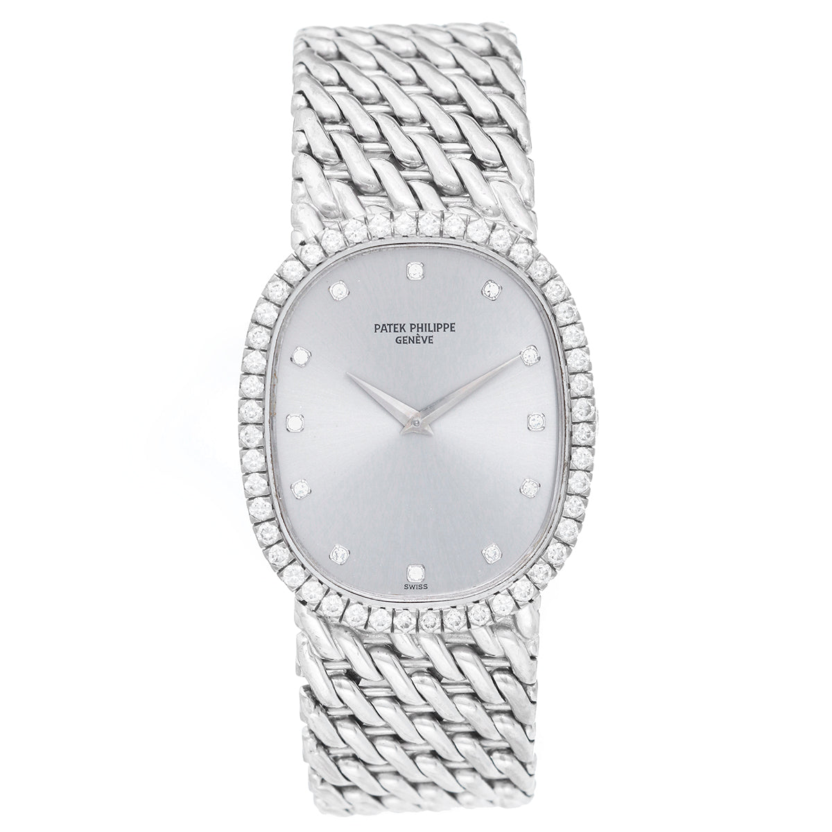 Patek Philippe Ellipse 18K White Gold 3748 / 091 Men's/Ladies watch - Quartz movement. 18k white gold case with factory diamond bezel (29mm x 34mm). Silver dial with diamond hour markers. 18k white gold integrated mesh bracelet. Pre-owned wth box.