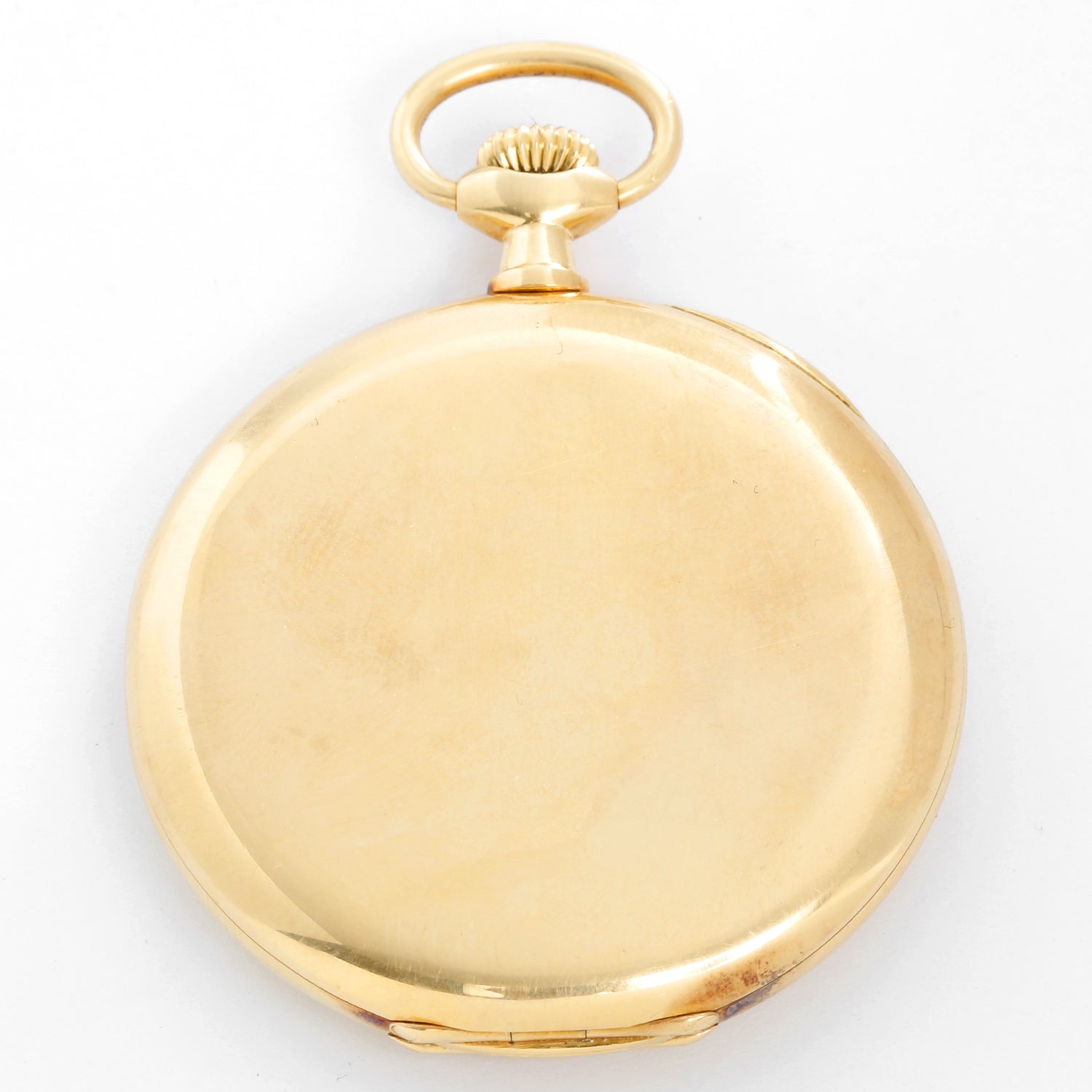 Patek Philippe 18K Yellow Gold Pocket Watch - Manual winding. 18K Yellow gold case ( 45 mm ). Champagne guilloche dial with accentuated Arabic numerals; subdial at 6 o'clock . Pre-owned with custom box. Circa 1940's