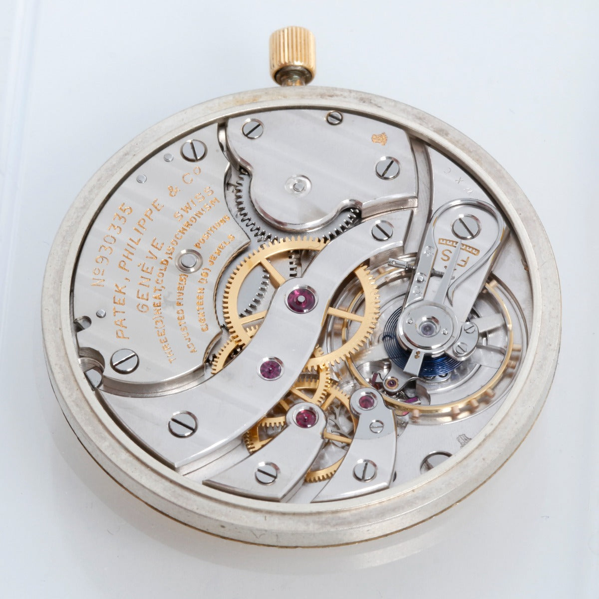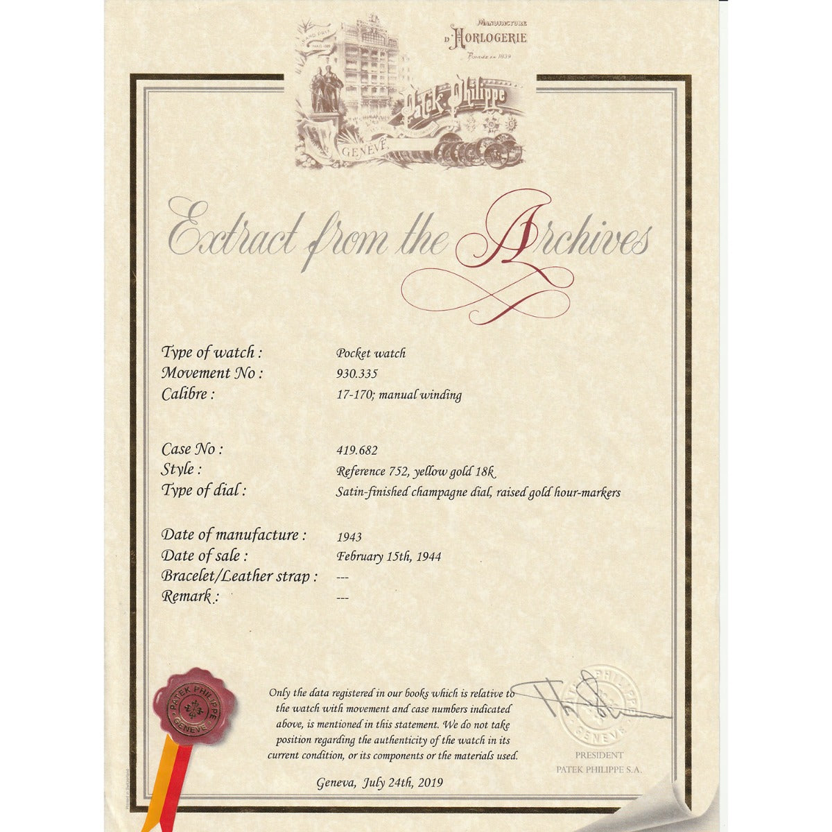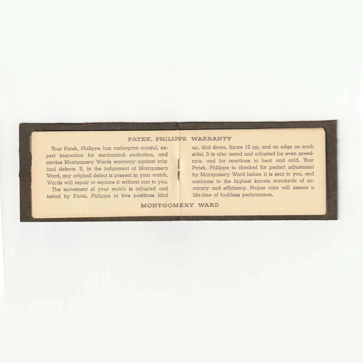 Patek Philippe 18K Yellow Gold Pocket Watch Presentation from Montgomery Ward - Manual winding. 18K yellow gold ( 48 mm ) rear with 1958 presentation from Montgomery Ward to C.A "Dinty" Mohr for 25 years of service. Champagne-colored metal dial with applied gold numerals. Comes as pictured with a fitted leather Patek Philippe box, with its original matching leather bound Patek Philippe registration booklet custom made for Montgomery Ward, and with Patek Philippe Extract from the Archives noting a 1943 date of manufacture and 1944 date of sale.