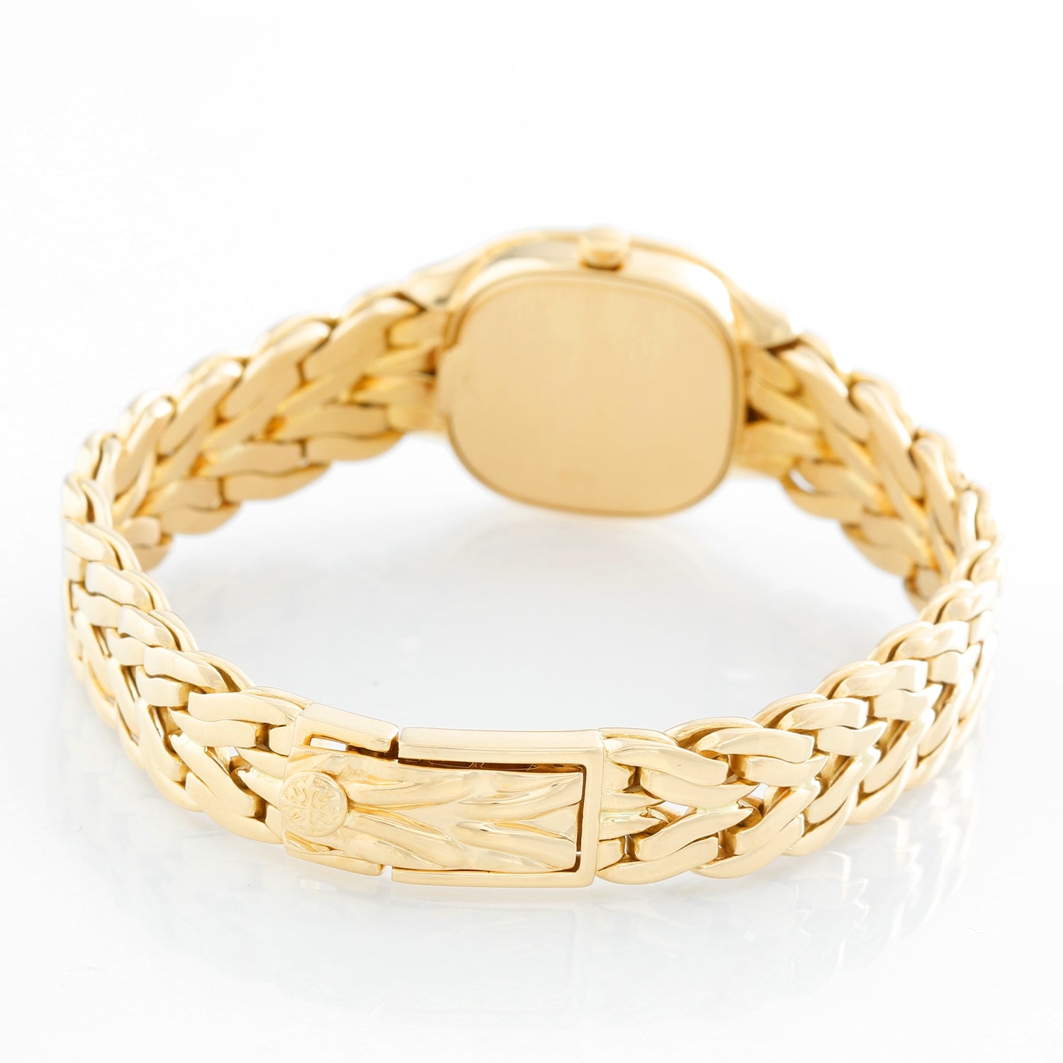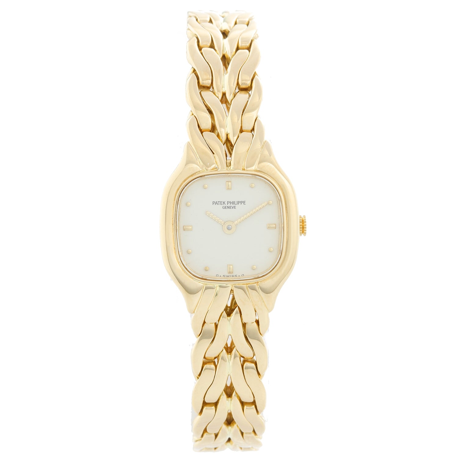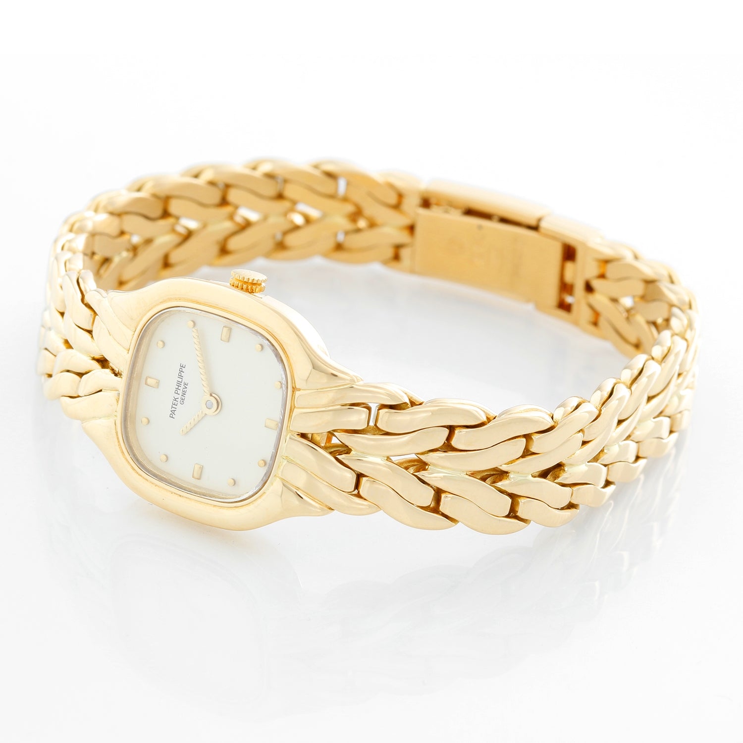 Patek Philippe & Co. La Flamme 18K Yellow Gold Watch Ref 4715/001 - Quartz. 18K Yellow Gold ( 22 x 27 mm ). Ivory dial with raised gold hour markers . 18K Yellow Gold bracelet; will fit up to a 6 1/2 wrist. Pre-owned with Patek Philippe box and papers.