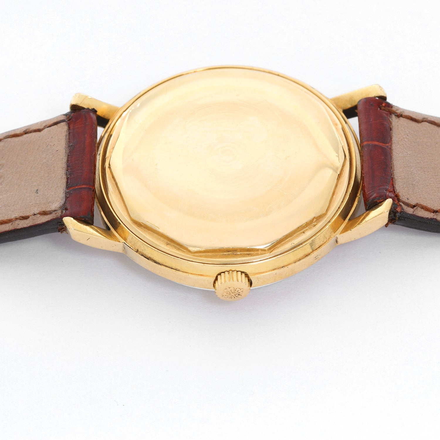 Patek Philippe & Co. Vintage Automatic Watch Ref 3445 - Automatic. 18K Yellow Gold ( 34 mm ). Very nice Patinaed dial with stick hour markers; date at 3 o'clock. Brown alligator strap with buckle. Pre-owned with Patek Philippe & Co. box and Archive papers. Circa Jan 1, 1963.