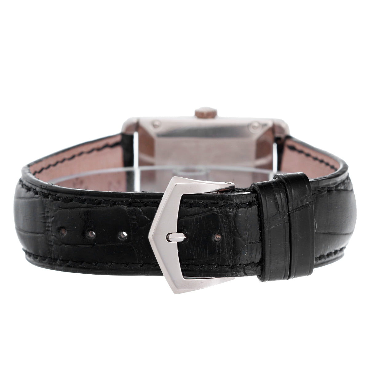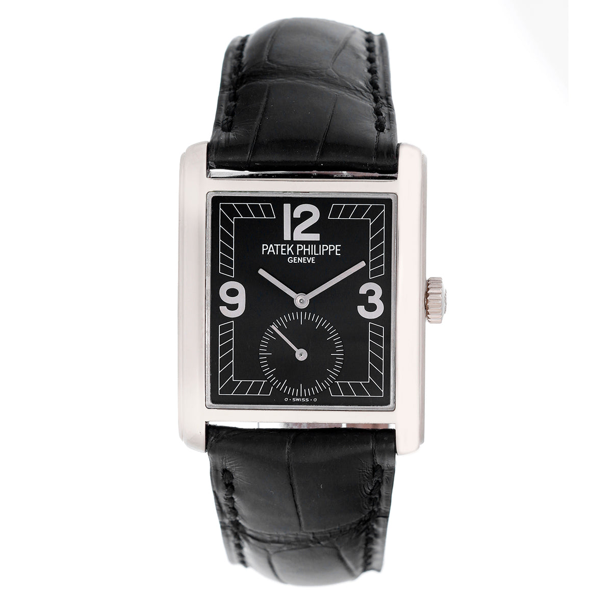 Mechanical, Manual winding. 18K White Gold (28mm x 35mm). Black Arabic numerals hour markers; small subsecond at 6 o'clock. Black croc bracelet with 18K White Gold Patek Philippe Tang buckle. Pre-owned w Patek Philippe box.