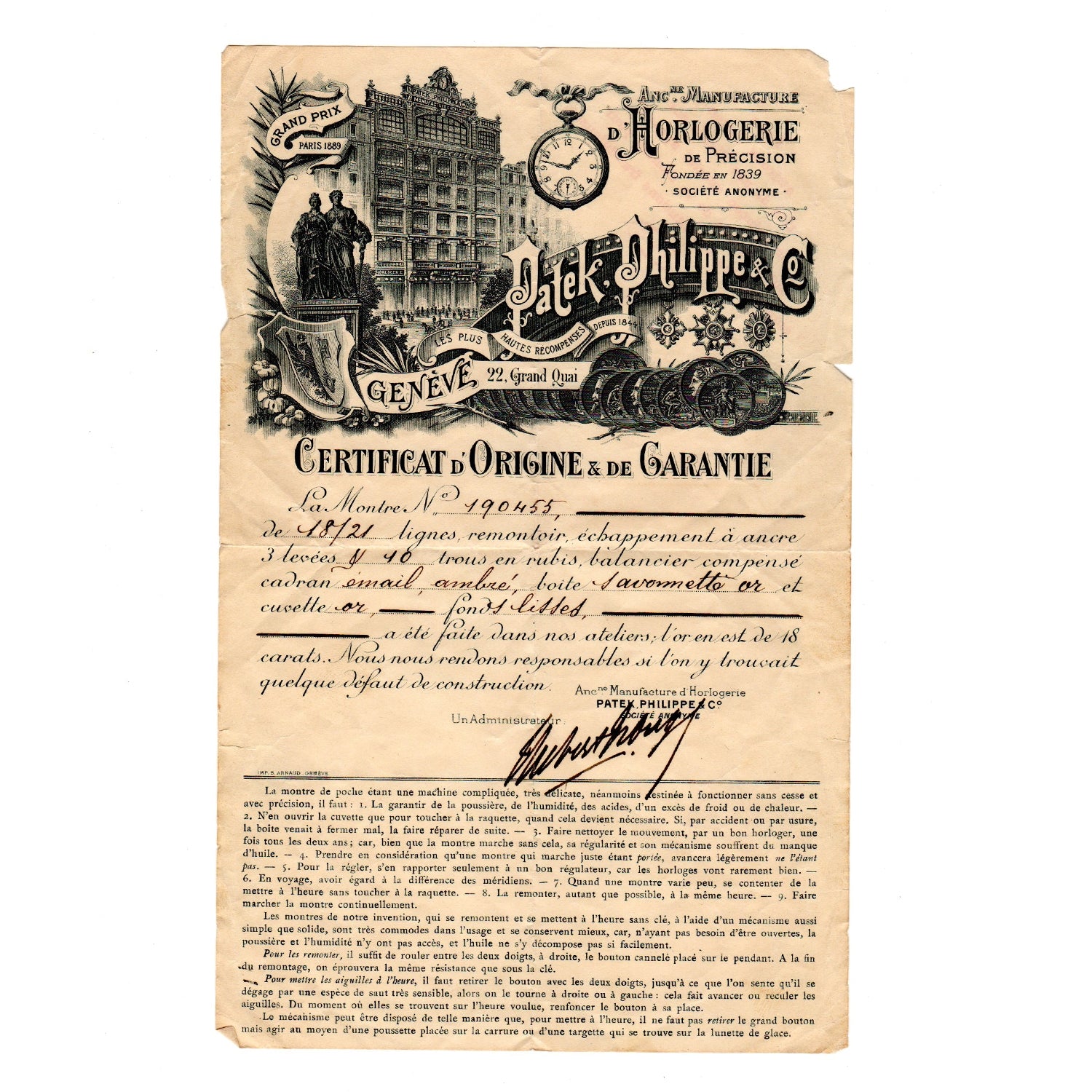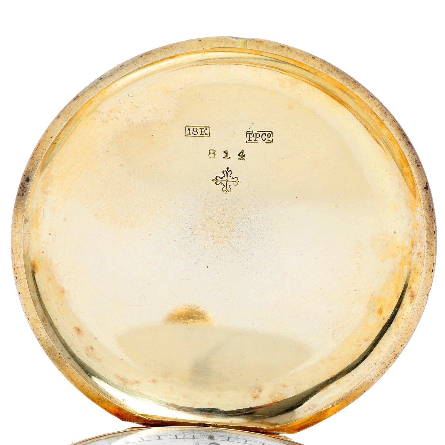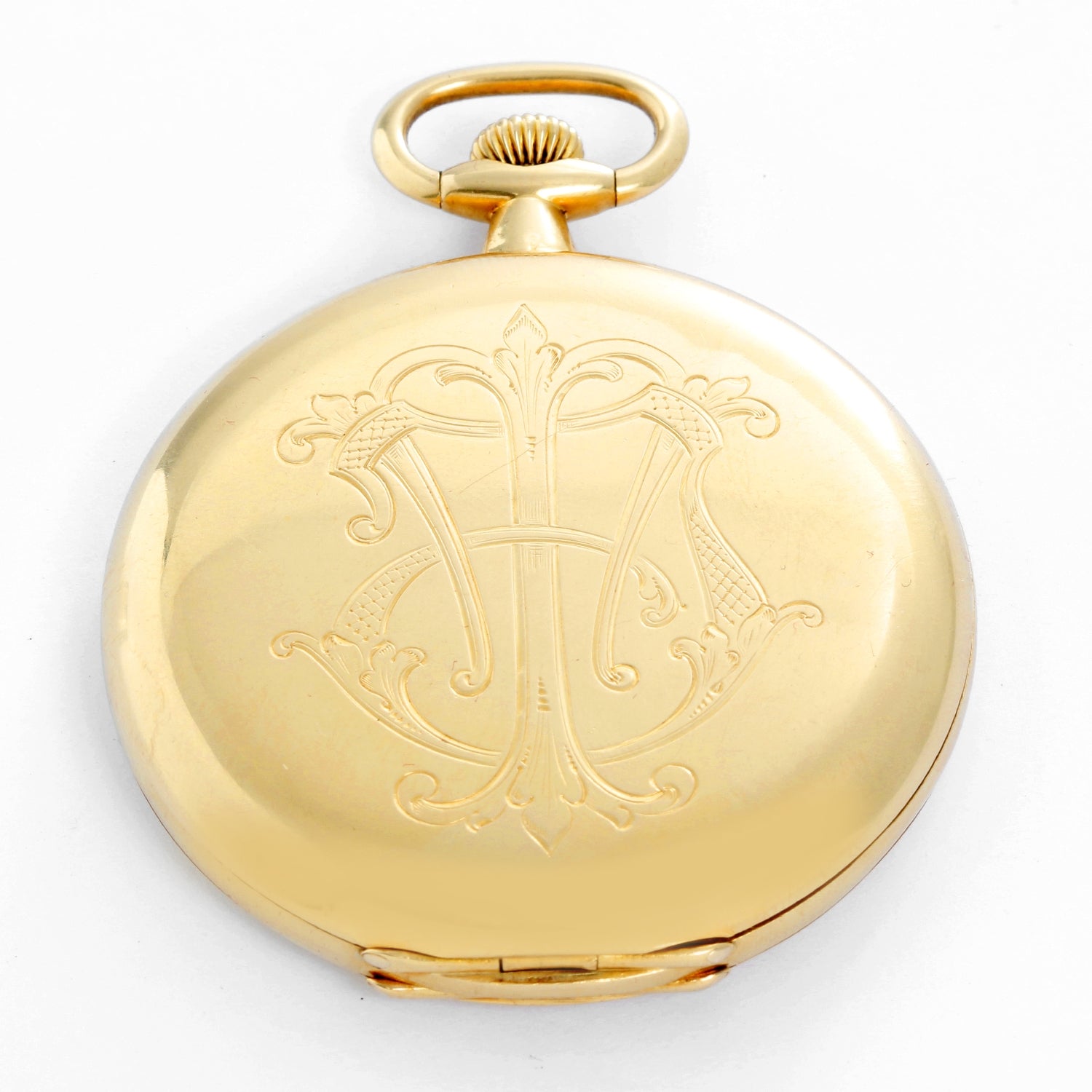 Patek Philippe Hunting Case Pocket Watch - Manual winding. 18K Yellow Gold case (54mm) Monogram on case. White dial with black Arabic Breguet numerals; sub seconds at 6 o'clock position. Case & dial are signed and numbered with movement No.190454. Pre-owned with Patek Philippe box and papers