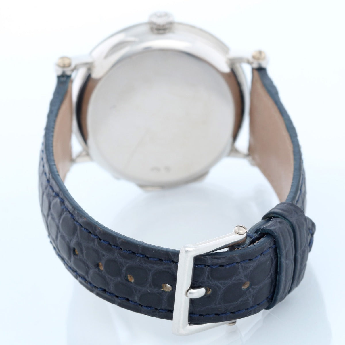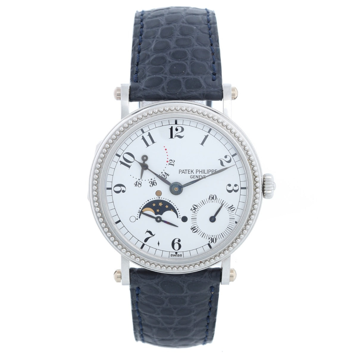 Patek Philippe Moonphase Calendar Platinum Ref. 5015P - Automatic winding. Platinum case with hobnail bezel ( 36 mm ) . White dial with black Arabic numerals; sub-seconds; date and moonphase; power reserve indicator. Black Patek Philippe strap band with Platnium Patek Philippe tang buckle. Pre-owned with Patek Philippe & Co. and papers.