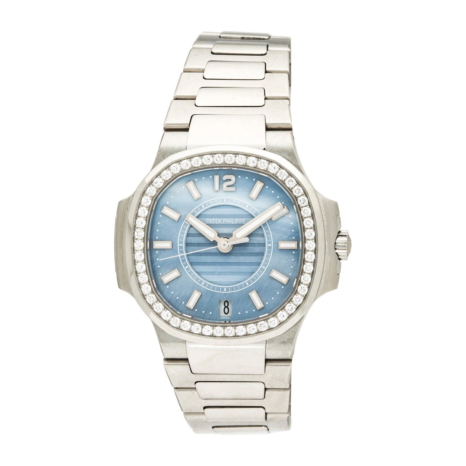 Patek Philippe Nautilus Ladies Stainless Steel Watch Ref. 7008 - Automatic . Stainless steel case with diamond bezel (33mm diameter). Blue Mother of Pearl . Stainless steel Patek Philippe bracelet with double deployant . Pre-owned with Patek Philippe box.