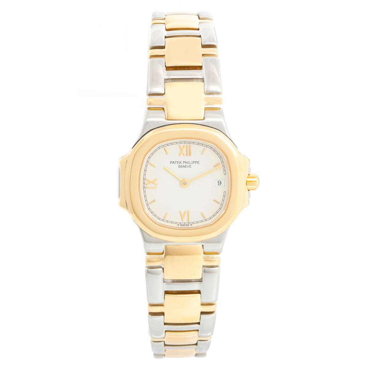 Patek Philippe Nautilus Ladies Steel Gold 2-Tone Watch 4700/61 - Quartz. Stainless steel case with 18k yellow gold bezel (26mm diameter). White dial with stick markers; date at 3 o'clock position. Stainless steel and 18k yellow gold Nautilus bracelet (will fit 5.75-inch wrist). Pre-owned with Patek Philippe pouch.