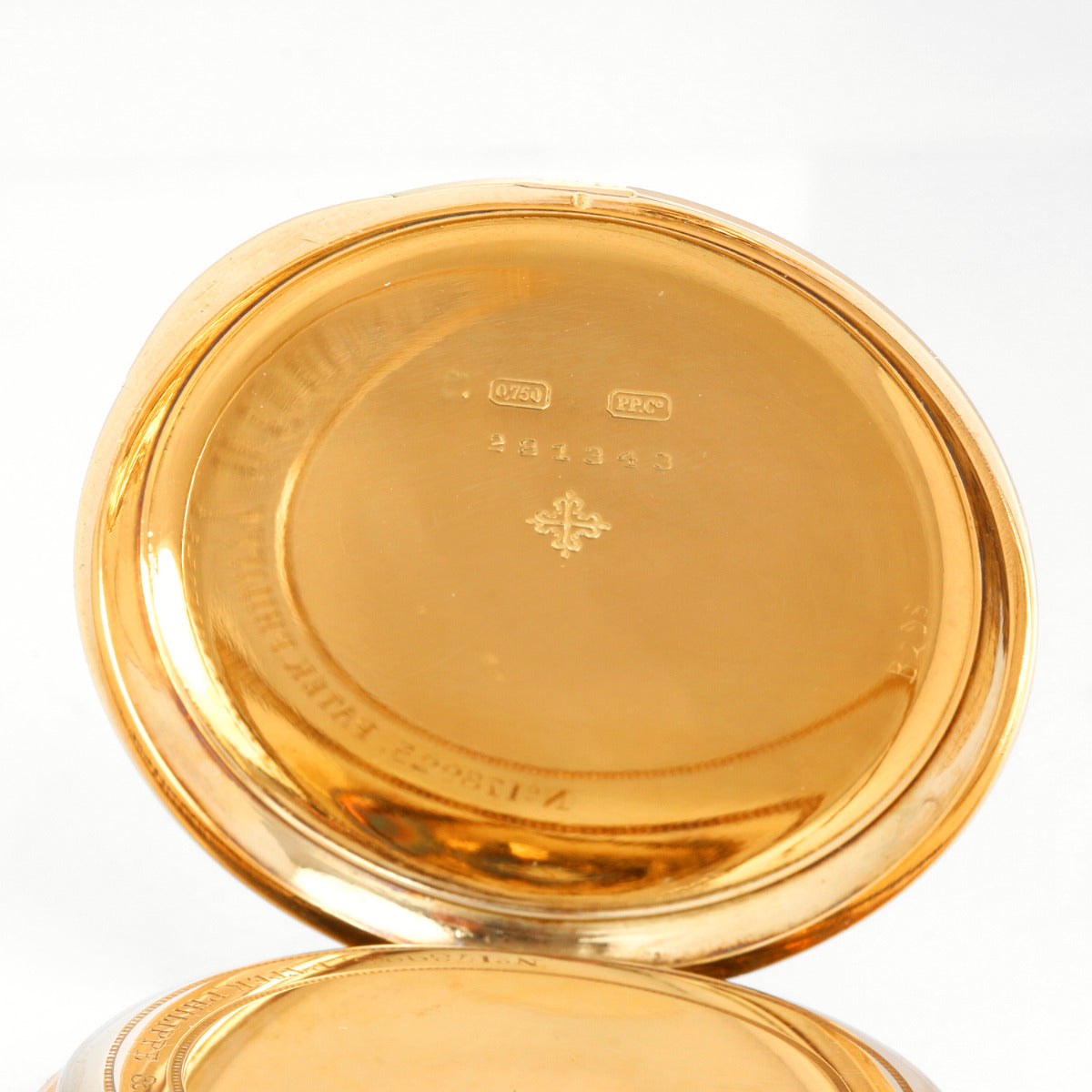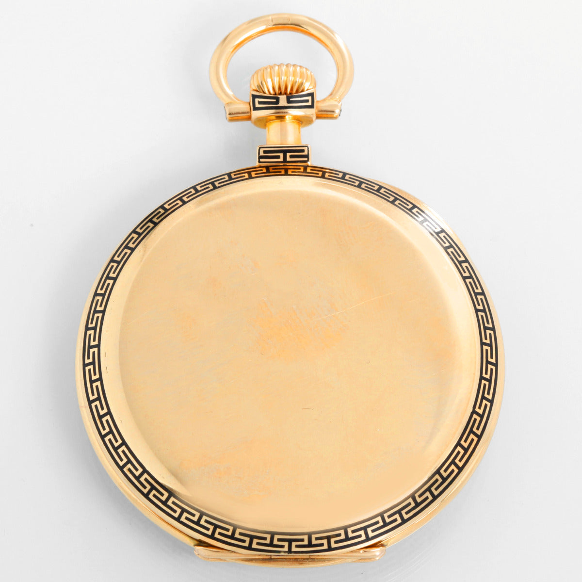 Patek Philippe Open Face 18K Yellow Gold Pocket Watch - Manual winding. 18K Yellow Gold ( 48 mm ) with Greek key black enameling to bezel rear perimeter and pendant, initials to rear, gold cuvette with signature ring. Cream colored enamel stainless steel dial with roman numerals . Pre-owned with custom box. Circa 1920's