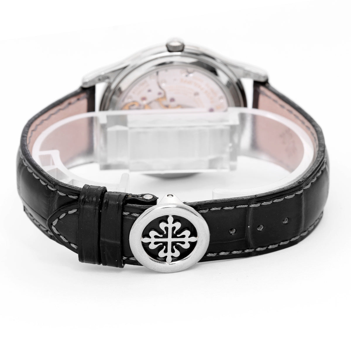 Patek Philippe Perpetual Calendar 5140 G - Automatic, sapphire crystal. 18K White gold ( 37.2 mm) Silver dial with stick markers and three subdials. Black croc strap band. Pre-owned with box and papers