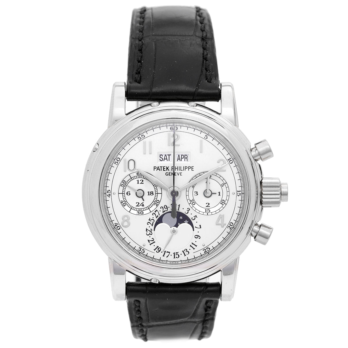 Patek Philippe Platinum Chronograph Perpetual Calendar Ref 5004 P - Manual. Platinum case with smooth bezel ( 37mm ). Silver dial with Chronograph Rattrapante/ Split Seconds Chronograph, Perpetual Calendar Moonphase. Black Crock band with Patek Philippe Deployant Clasp . Pre-owned with box.