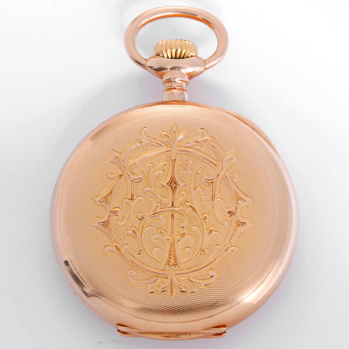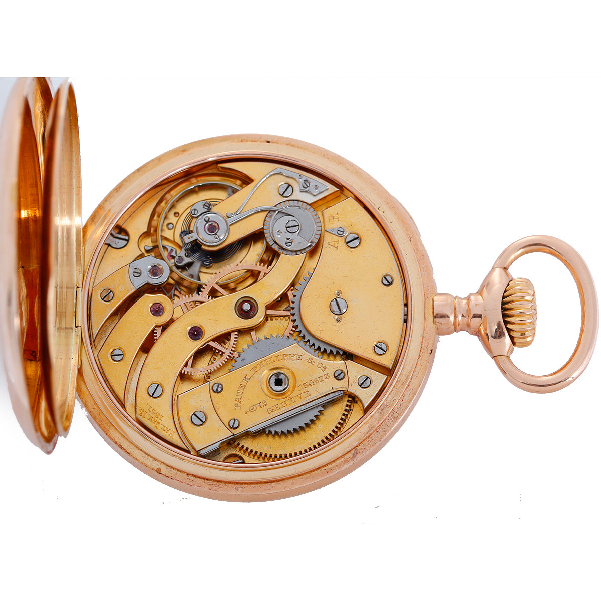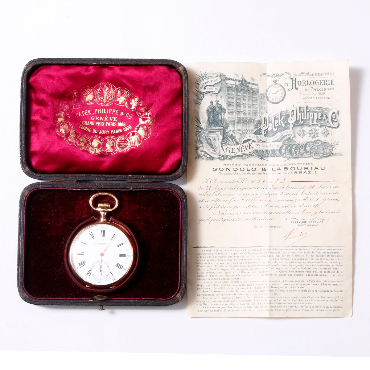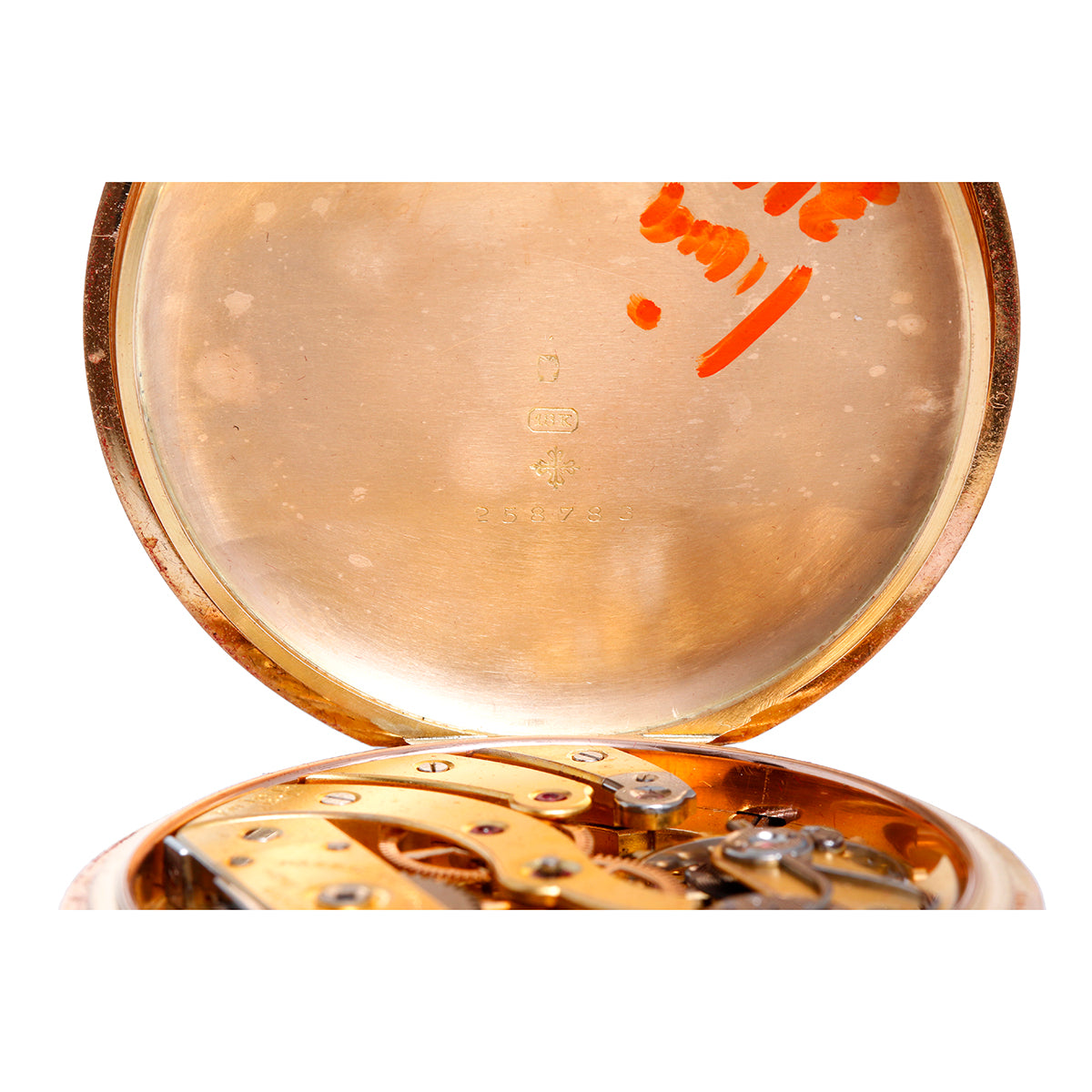 Rare Vintage Patek Philippe Relojoeiros Gondolo 18k Yellow Gold Open Face Pocket Watch - Manual winding. Huge 18k yellow case with very unique raised design on case back (50mm diameter). Single sunk dial porcelain with black Roman numerals. Rare and unusual oversized, pre-owned, vintage Patek pocket watch complete with original box and papers