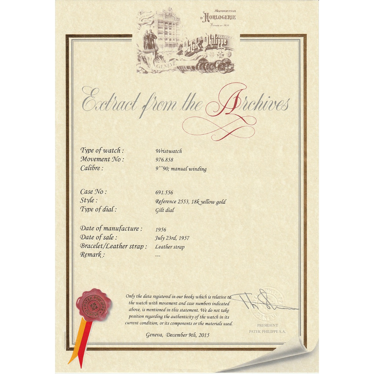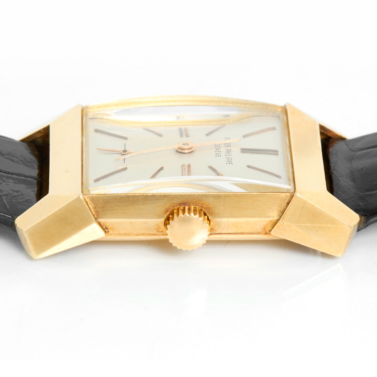 Extremely Rare And Collectable Vintage Mens Patek Philippe 18K Yellow Gold Dress Watch 2553 - Manual winding. 18K Yellow gold ( 22 x 38 mm) All case facets are still sharp and crisp and in unpolished condition. Untouched original silver dial with raised stick hour markers. Black Patek Philippe strap with 18K Yellow gold Patek buckle. Pre-owned with Patek Philippe Travel box and archive papers. Circa 1956.