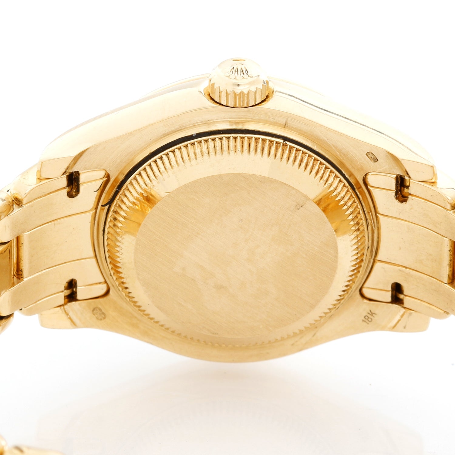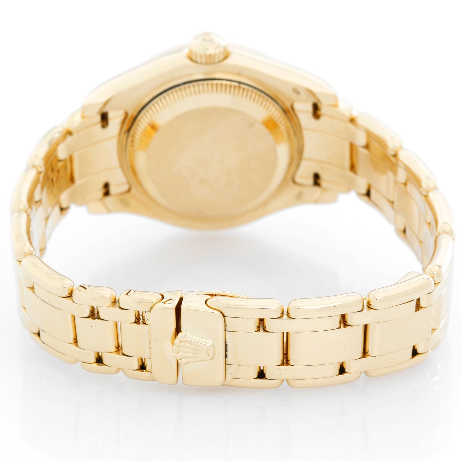 Rolex Ladies Masterpiece/Pearlmaster, Model 69318 - Ladies 18k yellow gold wristwatch with date display (29mm diameter). Sapphire crystal. 18k yellow gold 12 diamond bezel. 18k yellow gold Masterpiece bracelet. White dial with diamond markers. 31 jewel superlative officially certified chronometer movement. Pre-owned with Rolex box and book.